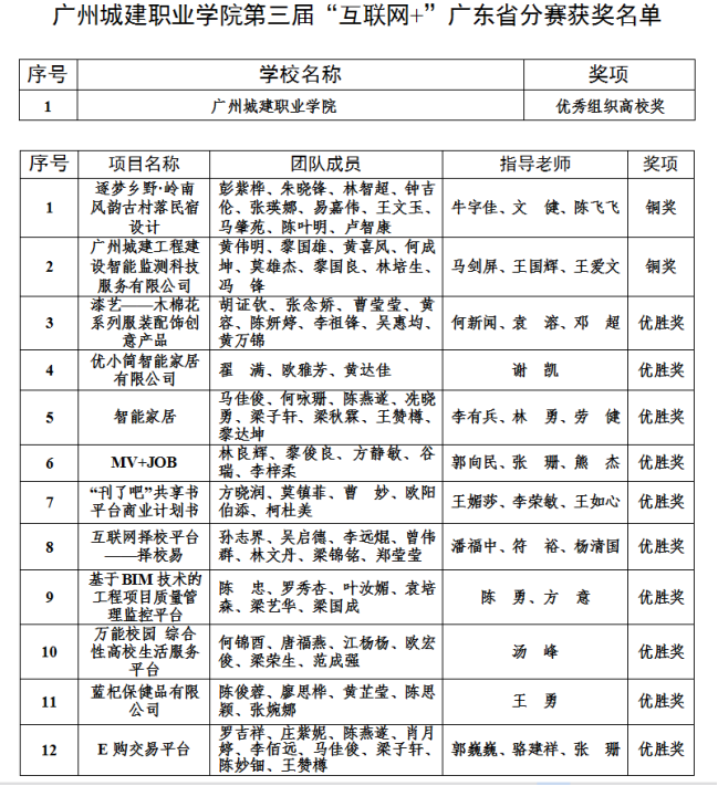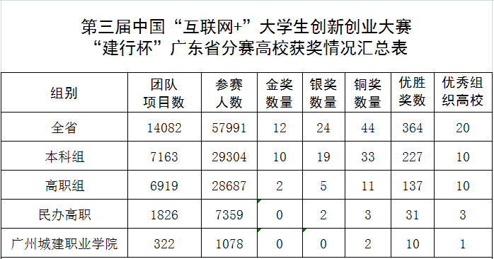 從《廣東省教育廳關于公布第三屆中國“互聯(lián)網(wǎng)+”大學生創(chuàng)新創(chuàng)業(yè)大賽“建行杯”廣東省分賽獲獎名單的通知》獲悉,我校在本屆比賽中獲“優(yōu)秀組織高校獎”1項、銅獎2項、優(yōu)勝獎10項。“互聯(lián)網(wǎng)+”大學生創(chuàng)新創(chuàng)業(yè)大賽至今已舉辦三屆,我校連續(xù)三年獲“優(yōu)秀組織高校獎”。全省共有10所高職院校獲此殊榮,我校是3所獲獎民辦高職院校之一;全省民辦高職院校共獲金銀銅獎5項,我校獨攬2項;全省民辦高職院校共獲優(yōu)勝獎31項,我校獨攬10項。