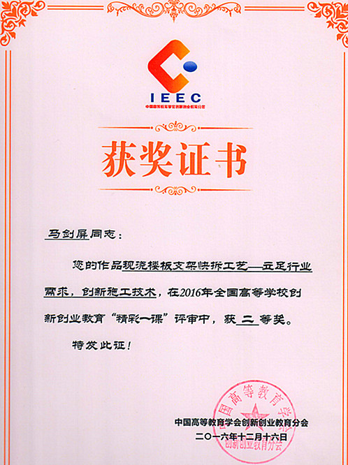 會議總結(jié)了一年來的工作,并對在全國高等學(xué)校創(chuàng)新創(chuàng)業(yè)教育工作中涌現(xiàn)出來的19個先進(jìn)集體、83名先進(jìn)個人和48篇優(yōu)秀論文及24門創(chuàng)新創(chuàng)業(yè)“精彩一課”進(jìn)行表彰。我校馬劍屏副教授的作品《現(xiàn)澆樓板支架快拆工藝——立足行業(yè)需求,創(chuàng)新施工技術(shù)》獲2016年全國高等學(xué)校創(chuàng)新創(chuàng)業(yè)教育“精彩一課”二等獎,并受邀在交流論壇上作經(jīng)驗分享。