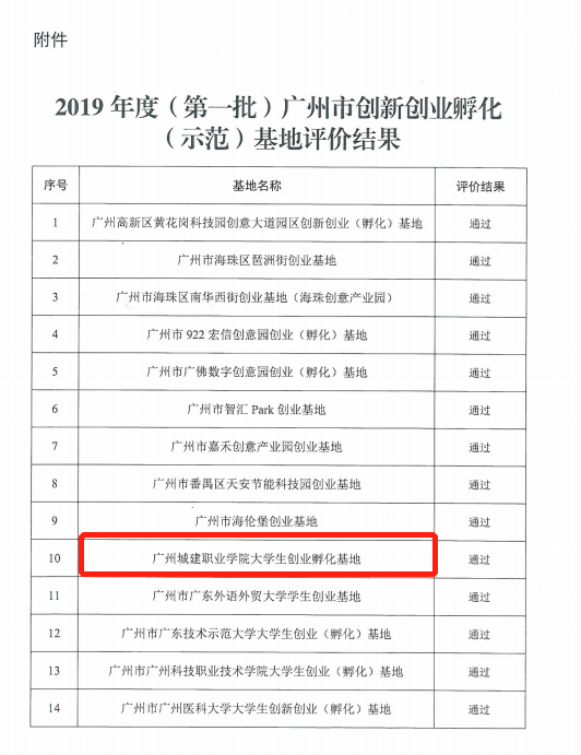 近日,廣州市人力資源和社會(huì)保障局下發(fā)《關(guān)于公布2019年度(第一批)廣州市創(chuàng)新創(chuàng)業(yè)孵化(示范)基地評(píng)價(jià)結(jié)果的通知》,我校大學(xué)生創(chuàng)業(yè)孵化基地經(jīng)審核順利通過(guò)評(píng)價(jià),被授予“廣州市創(chuàng)新創(chuàng)業(yè)(孵化)示范基地”稱號(hào),獲得2020年市級(jí)示范性創(chuàng)業(yè)孵化評(píng)價(jià)補(bǔ)貼20萬(wàn)元。