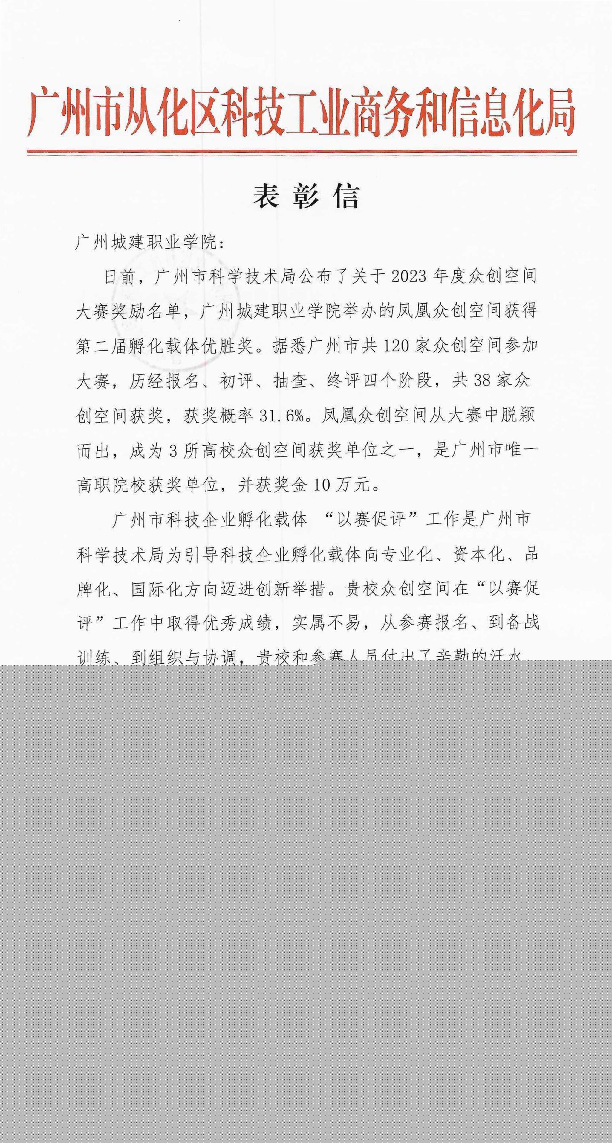 近日,我校收到廣州市從化區(qū)科技工業(yè)商務和信息化局發(fā)來的表彰信,祝賀我校鳳凰眾創(chuàng)空間獲獎。