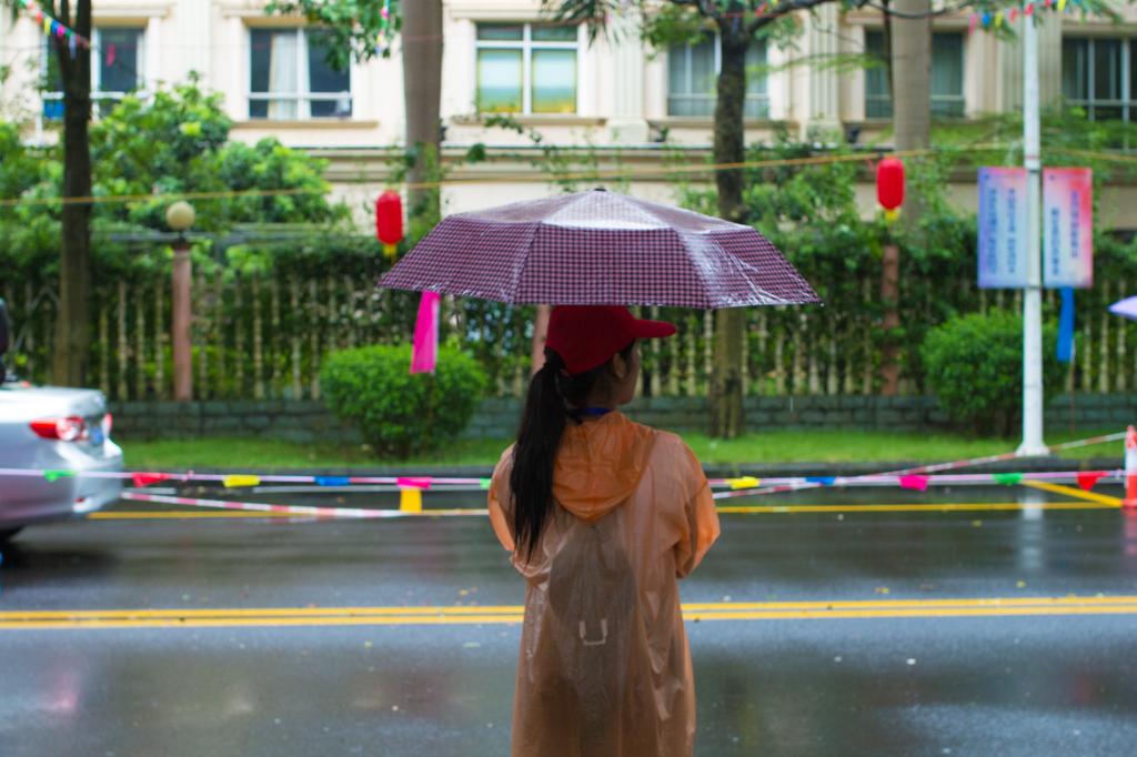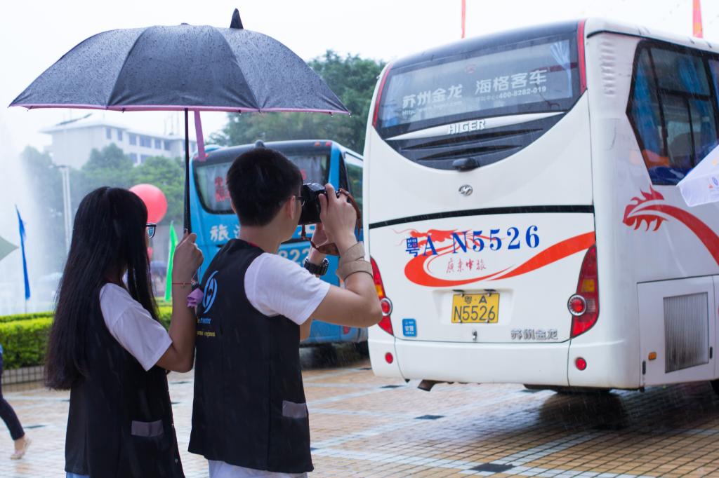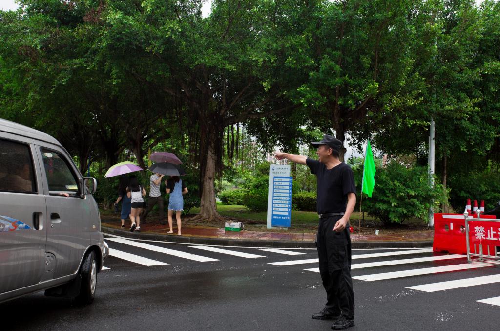 突如其來(lái)的陣雨停下了家長(zhǎng)和學(xué)生們的腳步,他們只好躲在建筑物下避雨。此時(shí),身穿彩色透明雨衣的志愿者們出現(xiàn)了,他們拿著帳篷大小的傘快步走向人群,“嘩”地一聲把傘打開(kāi),說(shuō):“快進(jìn)來(lái),我們送你們過(guò)去,行李在哪?我們提就好!”家長(zhǎng)們不禁連聲道謝,隨同志愿者們漸行漸遠(yuǎn)。