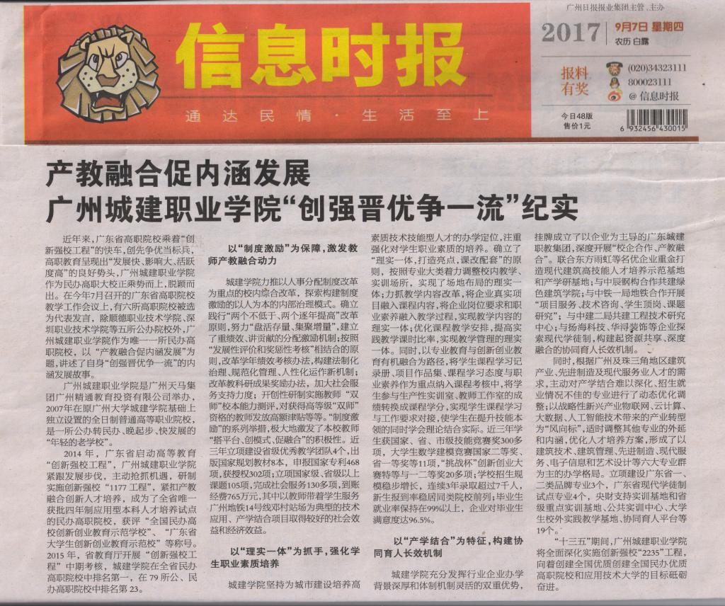 今年7月,廣東省高等職業(yè)院校教學(xué)工作會(huì)議在順德職業(yè)技術(shù)學(xué)院召開。劉國(guó)生校長(zhǎng)作為省教育廳指定作典型經(jīng)驗(yàn)介紹的六所高職院校中唯一一所民辦院校校長(zhǎng),在會(huì)上作了《從理實(shí)一體到產(chǎn)學(xué)結(jié)合——廣州城建職業(yè)學(xué)院產(chǎn)教融合促內(nèi)涵發(fā)展的探索與實(shí)踐》專題發(fā)言,從“以‘理實(shí)一體’為抓手,強(qiáng)化學(xué)生職業(yè)素質(zhì)培養(yǎng);以‘產(chǎn)學(xué)結(jié)合’為特征,構(gòu)建協(xié)同育人長(zhǎng)效機(jī)制;以‘制度激勵(lì)’為保障,激發(fā)教師產(chǎn)教融合動(dòng)力”三方面介紹了學(xué)?!皠?chuàng)強(qiáng)晉優(yōu)爭(zhēng)一流”的發(fā)展事跡。發(fā)言受到與會(huì)領(lǐng)導(dǎo)、同行及媒體的高度關(guān)注和一致好評(píng),對(duì)我校辦學(xué)理念、隊(duì)伍建設(shè)、人才培養(yǎng)等方面的做法和經(jīng)驗(yàn)表現(xiàn)出濃厚的興趣和熱情。會(huì)后,《信息時(shí)報(bào)》對(duì)我校的典型事跡進(jìn)行了深度采訪,并以《產(chǎn)教融合促內(nèi)涵發(fā)展——廣州城建職業(yè)學(xué)院“創(chuàng)強(qiáng)晉優(yōu)爭(zhēng)一流”紀(jì)實(shí)》為題作了重點(diǎn)報(bào)道。