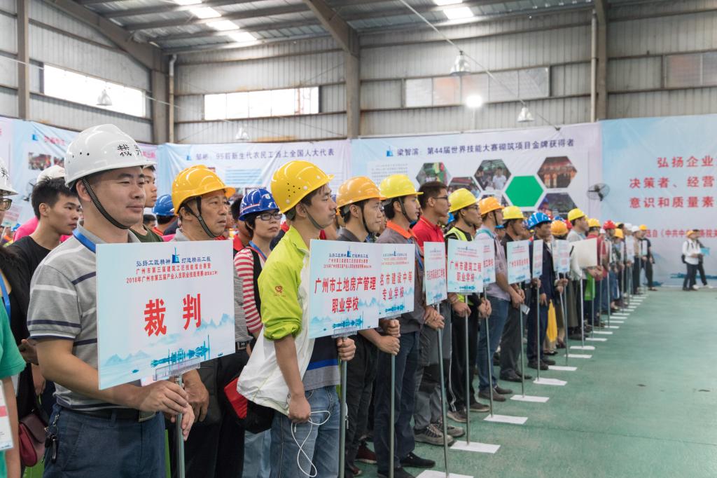 本屆擂臺賽選用目前廣東省內(nèi)最大規(guī)模的封閉式建筑公共實訓基地——廣州城建職業(yè)學院現(xiàn)代建筑技術職業(yè)技能公共實訓中心作為賽場,建筑產(chǎn)業(yè)工人隊伍培訓與建筑工匠技能擂臺賽相結合,賽前進行了砌筑工鑲貼工鋼筋工集訓,并邀請了在穗建筑企業(yè)代表以及所有參賽企業(yè)等逾百家企業(yè)代表親臨比賽現(xiàn)場進行觀摩學習,提升了業(yè)界對裝配式建筑的了解與認識,為推動建筑產(chǎn)業(yè)轉(zhuǎn)型升級起到了示范效應。