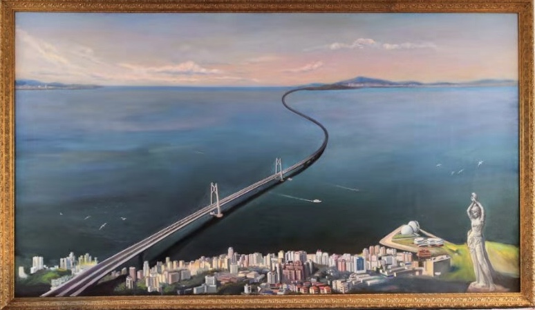 在浩瀚的伶仃洋,有這樣一條雄偉壯闊的“跨海長虹”,連接香港、珠海與澳門,集橋、島、隧為一體,它就是被英國《衛(wèi)報》評為“新世界七大奇跡”的港珠澳大橋。在廣州城建職業(yè)學(xué)院,有這樣的一位藝術(shù)家——曹廣豫教授,他以畫筆筑夢,為時代繪像,創(chuàng)作了《南海長虹——港珠澳大橋》巨幅油畫。