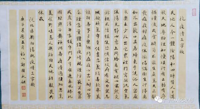 據(jù)悉,疫情發(fā)生后,從化區(qū)文聯(lián)迅速組織全區(qū)文藝界積極行動起來,創(chuàng)作了一系列廣受關(guān)注的作品,用真情為抗擊疫情擂鼓助威,共創(chuàng)作疫情防控宣傳順口溜、詩詞93首,美術(shù)作品42幅、書法作品174幅、攝影作品136張、歌曲10首。其中,《力量》《抗擊冠狀病毒三字歌》《防惡疫》《搏“疫”六字訣》《抗疫歌》《預(yù)防冠狀病毒肺炎順口溜》等作品,為身在一線的醫(yī)護人員點贊,也為市民群眾宣傳了防護知識,凝聚了合力抗擊病魔的正能量。