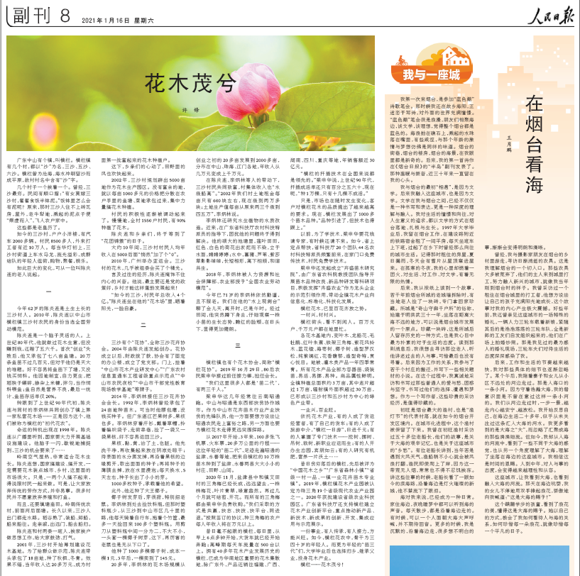 1月16日,《人民日報》大地副刊頭條發(fā)表廣東省農(nóng)村科技特派員、國家一級作家、我校許鋒老師撰寫的紀實散文《花木茂兮》。