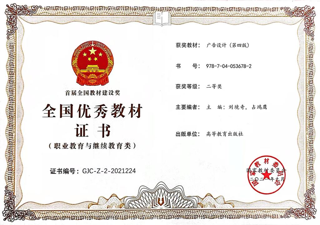 10月9日,國家教材委員會發(fā)布《關于首屆全國教材建設獎獎勵的決定》,藝術與設計學院院長劉境奇教授等主編的《廣告設計》榮獲全國優(yōu)秀教材(職業(yè)教育與繼續(xù)教育類)二等獎。