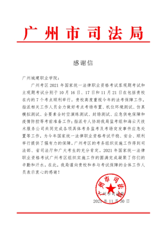 11月30日,學(xué)校收到廣州市司法局發(fā)來的感謝信,對(duì)我校參與組織2021年國家統(tǒng)一法律職業(yè)資格考試工作給予充分肯定。