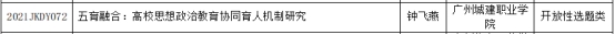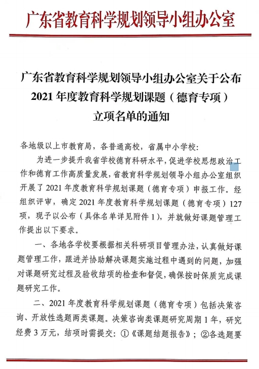 4月24日,在《廣東省教育科學(xué)規(guī)劃領(lǐng)導(dǎo)小組辦公室關(guān)于公布2021年度教育科學(xué)規(guī)劃課題(德育專項) 立項名單的通知》中,我校鐘飛燕老師申報的課題《五育融合:高校思想政治教育協(xié)同育人機制研究》(2021JKDY072)獲準(zhǔn)立項。