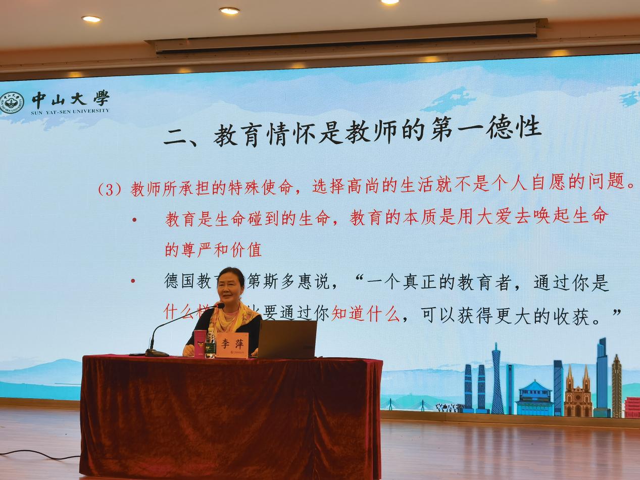 李萍教授以“師者情懷——倫理教育的德性與核心價(jià)值之思”為主題,從道德情感與情懷、教育情懷是教師的第一德性兩個(gè)部分,詳細(xì)闡述了師者情懷的豐富內(nèi)涵。她認(rèn)為,情懷是一種倫理的道德情感,是一種美好的、高尚的心境、情趣和胸懷。教育情懷是教師的第一德性,教師德性內(nèi)生于教師職業(yè),教育的本質(zhì)是用大愛(ài)去喚起生命的尊嚴(yán)和價(jià)值。她鼓勵(lì)教師對(duì)教育要有信仰之情,對(duì)教師職業(yè)要有敬畏之心,對(duì)學(xué)生要有關(guān)懷之意,這樣才能更好地做經(jīng)師、做人師,讓學(xué)生獲得心智心靈的健康、和諧成長(zhǎng),真正當(dāng)好學(xué)生成長(zhǎng)的引路人!