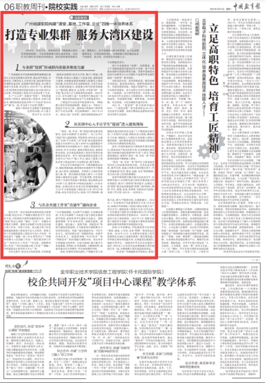 6月14日,校長(zhǎng)蔣新華教授在《中國(guó)教育報(bào)》《職教周刊·院校實(shí)踐》版頭條發(fā)表重要文章《廣州城建職院構(gòu)建“課堂、基地、工作室、企業(yè)”四維一體培養(yǎng)體系 打造專業(yè)集群 服務(wù)大灣區(qū)建設(shè)》。
