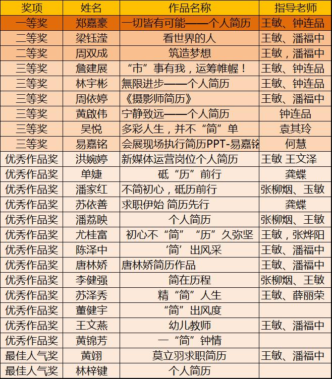 近日,“軟件通杯”第五屆廣東省職業(yè)院校簡歷創(chuàng)意設(shè)計大賽圓滿落幕,本次大賽由廣東省職業(yè)院校圖書館情報工作指導(dǎo)委員會、省高等學(xué)校圖書情報工作指導(dǎo)委員會高職高專分委會主辦,自活動啟動以來,共有2500余份作品參賽,我校共提交參賽作品70余份,經(jīng)專家組對入圍作品從內(nèi)容、格式、美觀性、信息量等進行嚴(yán)格評審,我校參賽作品共獲一等獎1名、二等獎2名、三等獎6名、優(yōu)秀獎13名、最佳人氣獎2名,同時我校卓爾吉一湄、王敏兩位老師榮獲“優(yōu)秀組織教師獎”,圖書館獲“優(yōu)秀組織獎”。