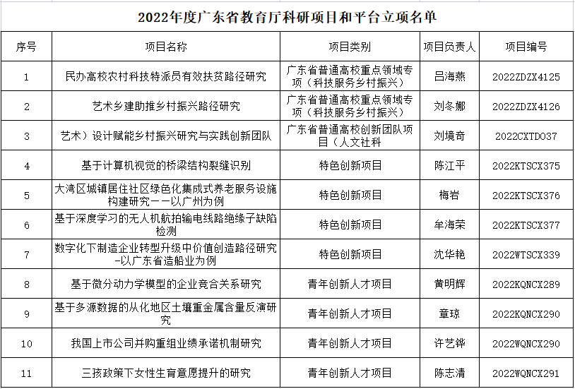近日,廣東省教育廳公布2022年度普通高校重點科研平臺和項目立項名單及2022年度普通高校認定類科研項目立項名單,其中,我校共有11個項目獲批立項(重點領域2項,重點平臺1項,特色創(chuàng)新項目4項,青年創(chuàng)新項目4項),立項數(shù)量在全省民辦高職院校校中名列前茅。