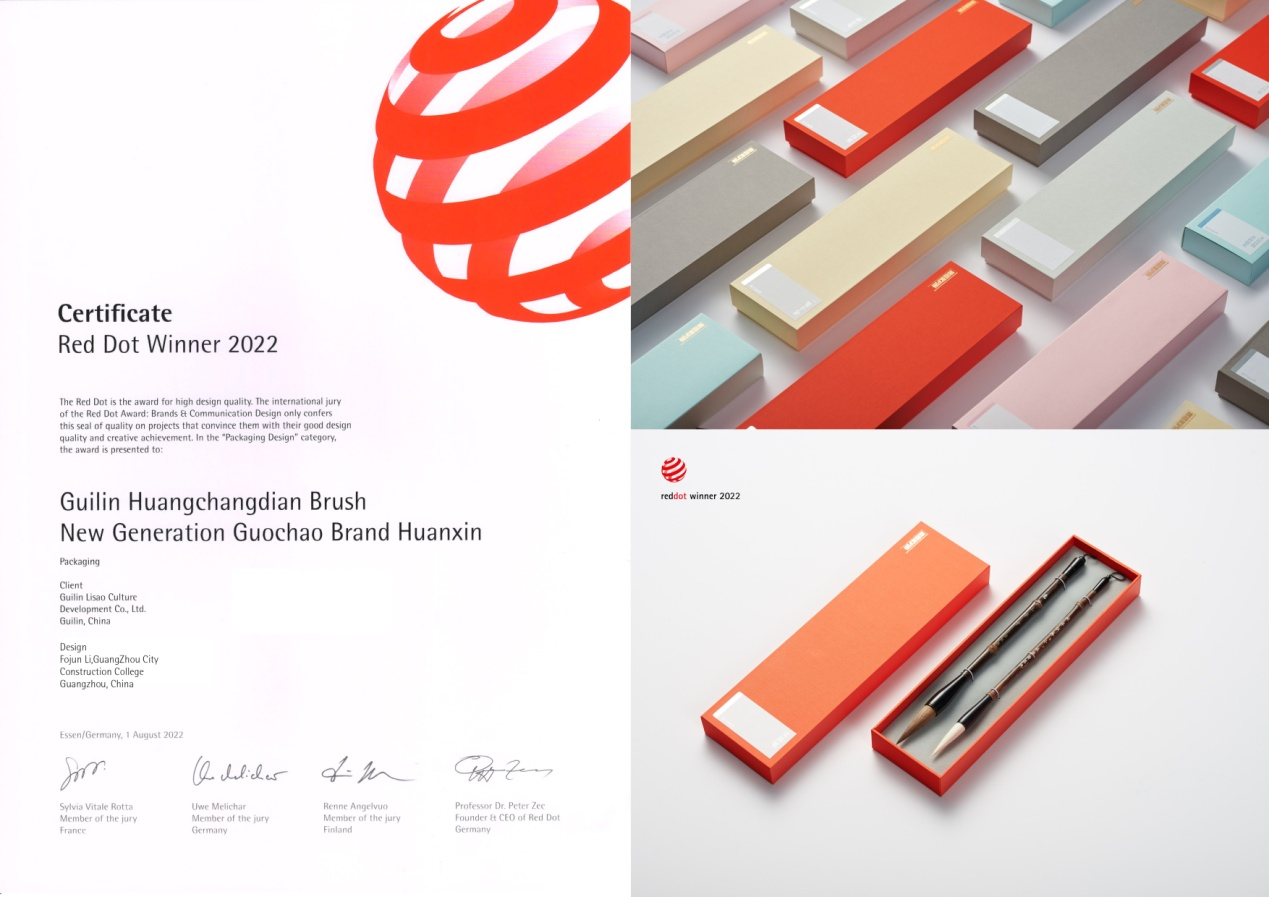 近日,德國紅點獎組委會發(fā)來喜訊:由我校藝術(shù)與設(shè)計學(xué)院副院長、特聘教授李佛君領(lǐng)銜的創(chuàng)新設(shè)計師生團(tuán)隊創(chuàng)作的《百年老字號:桂林黃昌典毛筆新世代國潮品牌煥新》品牌系統(tǒng)和包裝設(shè)計作品獲得2022德國紅點設(shè)計獎。這是團(tuán)隊繼獲得2020、2021德國紅點獎、4項2021德國IF獎之后,所獲得的第7項世界著名設(shè)計獎項!是團(tuán)隊聯(lián)動校企合作資源合力完成的首個品牌煥新及包裝產(chǎn)品設(shè)計項目,也是學(xué)校近年來大力促進(jìn)技術(shù)服務(wù)和校企合作的重要成果。