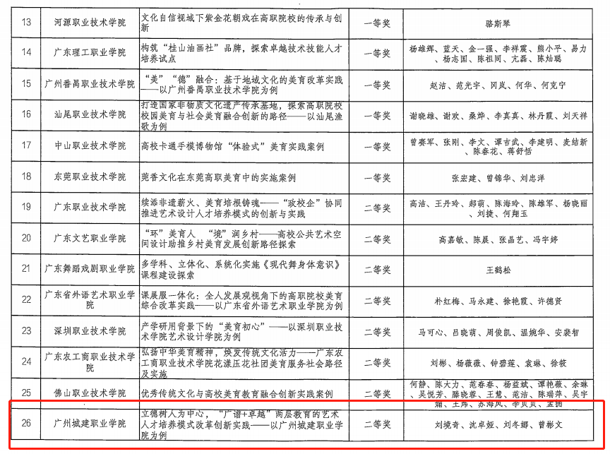 近日,廣東省教育廳先后公布了“第五屆粵港澳大灣區(qū)學(xué)校美術(shù)作品展暨第七屆廣東省高校美術(shù)作品學(xué)院獎(jiǎng)雙年展”和高校美育優(yōu)秀案例評(píng)選活動(dòng)的獲獎(jiǎng)名單,由我校推薦的美術(shù)作品《行·問》獲高校組一等獎(jiǎng)(作者:吳芯琳)、美育優(yōu)秀案例《立德樹人為中心,“廣譜+卓越”兩層教育的藝術(shù)人才培養(yǎng)模式改革創(chuàng)新實(shí)踐——以廣州城建職業(yè)學(xué)院為例》獲高職組二等獎(jiǎng)(項(xiàng)目成員:劉境奇、沈卓婭、劉冬娜、曾彬文)。