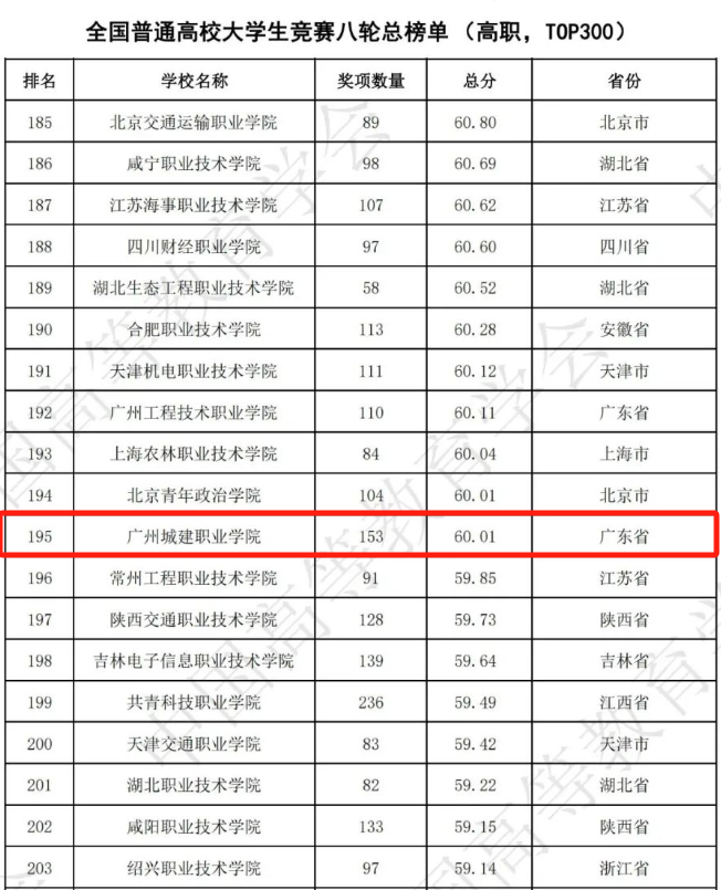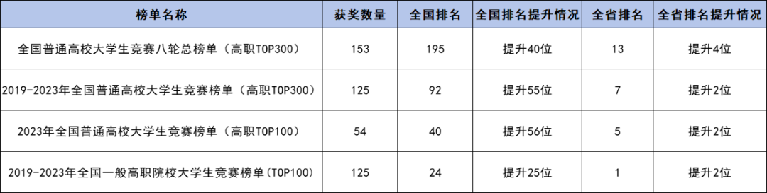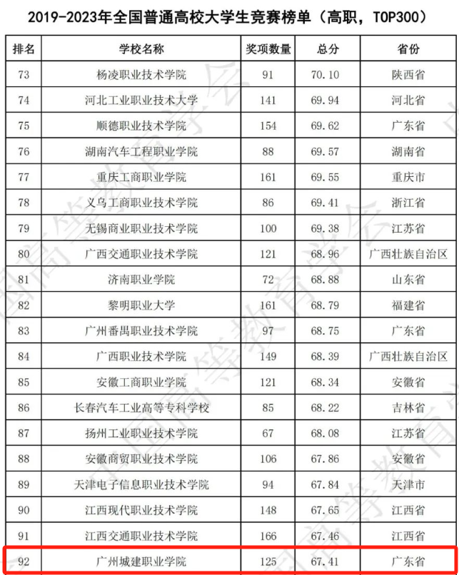 3月22日,中國高等教育學(xué)會發(fā)布《2023全國普通高校大學(xué)生競賽分析報告》,我校在系列榜單排名中均取得歷史最好成績,在2023年全國普通高校大學(xué)生競賽榜單中位列全國40位、廣東省第5位,在全國普通高校大學(xué)生競賽第八輪總榜單(高職,TOP300)中位列全國195位(較去年上升40位)、廣東省第13位,在2019-2023年(5年)全國普通高校大學(xué)生競賽榜單(高職,TOP300)位列全國第92位(較去年上升55位)、廣東省第7位,在2019-2023年(5年)全國一般高職院校大學(xué)生競賽榜單(高職,TOP300)位列全國第24位(較去年上升25位)、廣東省第1位,充分展示了我校推動創(chuàng)新人才培養(yǎng)方面取得的顯著成效。