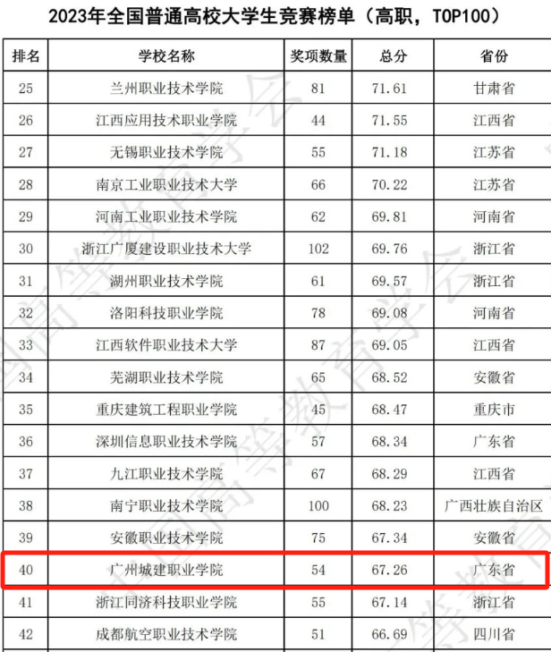 近年來,我校學(xué)生競賽成績不斷攀登,發(fā)展勢頭強勁,在2022年位列全國第96位,2023年躍升至全國第40位,提升了56名。此次全國競賽排名大幅上升,是學(xué)校著力提升人才培養(yǎng)質(zhì)量的必然結(jié)果,也是學(xué)校上下通力合作的奮進體現(xiàn),更是學(xué)校師生踐行“志存高遠,敢為人先;求真務(wù)實,勤奮敬業(yè);百折不撓,追求卓越”的城建精神的生動實踐,充分彰顯了城建學(xué)院在教學(xué)科研、人才培養(yǎng)、創(chuàng)新競賽等方面的競爭優(yōu)勢,客觀體現(xiàn)了學(xué)校的辦學(xué)水平、綜合實力和社會影響力。2024年,學(xué)校開啟高質(zhì)量發(fā)展新航程,下一步,將進一步完善富有城建學(xué)院特色的人才培養(yǎng)體系,打造創(chuàng)新型技術(shù)技能人才培養(yǎng)的“城建模式”,培養(yǎng)更多具有創(chuàng)新精神和實踐能力的高素質(zhì)技術(shù)技能人才,為廣東制造業(yè)當家、加快建設(shè)粵港澳大灣區(qū)貢獻城建力量。