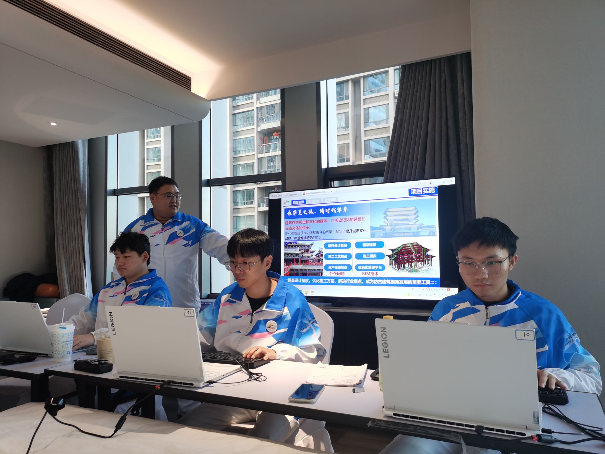 面對全新賽制挑戰(zhàn),我校參賽隊緊扣生產(chǎn)一線作業(yè)內(nèi)容,結(jié)合學(xué)校BIM工作室產(chǎn)教融合的地標(biāo)性項目,將BIM技術(shù)應(yīng)用與建筑文化傳承相融合,圍繞項目背景、職業(yè)技能、項目成果和創(chuàng)新創(chuàng)意4個方面,悉心規(guī)劃參賽項目主題與內(nèi)容,有效解決仿古建筑結(jié)構(gòu)設(shè)計復(fù)雜、施工難度大的問題,提高設(shè)計精度、優(yōu)化施工方案解決施工難點,并克服了時間緊、競賽方式變化大等困難,充分調(diào)動師生日夜奮力備戰(zhàn),最終取得優(yōu)異成績。