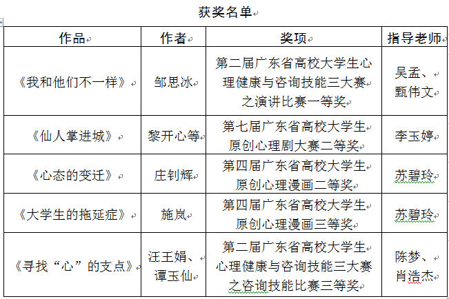 由廣東省高校心理健康教育與咨詢專業(yè)委員會舉辦的廣東省高校大學生第四屆原創(chuàng)心理漫畫大賽、第七屆原創(chuàng)心理劇大賽和第二屆心理健康與咨詢技能大賽歷時5個月,在11月份均落下帷幕,我校學子在和來自全省各高校優(yōu)秀學生的激烈角逐中脫穎而出,榮獲佳績。