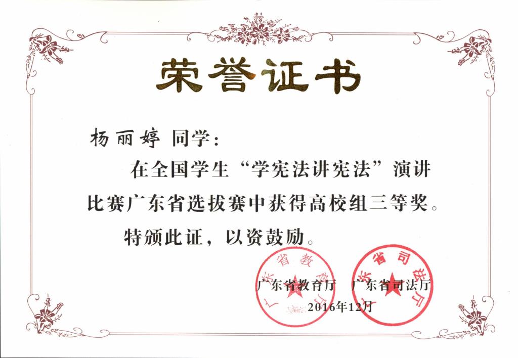 日前,從廣東省教育廳主辦,廣東省司法廳承辦的全國學(xué)生“學(xué)憲法講憲法”演講比賽廣東省選拔賽獲獎名單獲悉,我校學(xué)生楊麗婷獲高校組三等獎。