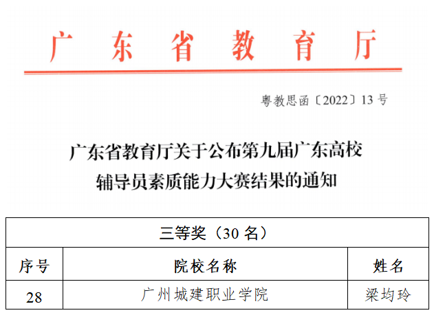 6月6日,第九屆廣東高校輔導(dǎo)員素質(zhì)能力大賽結(jié)果揭曉,信息工程學(xué)院輔導(dǎo)員梁均玲在本次大賽中榮獲三等獎(jiǎng)。