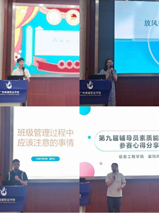 建筑工程學(xué)院學(xué)工副院長(zhǎng)張雙以《當(dāng)好排頭兵畫好同心圓”》為主題,圍繞學(xué)院學(xué)生工作基本情況、特色亮點(diǎn)、經(jīng)驗(yàn)做法等方面進(jìn)行分享。人文學(xué)院輔導(dǎo)員李垚森以《共青春共成長(zhǎng)》為主題分享了團(tuán)學(xué)工作經(jīng)驗(yàn),經(jīng)濟(jì)與管理院學(xué)院輔導(dǎo)員衛(wèi)鳳瓊、外語(yǔ)外貿(mào)學(xué)院輔導(dǎo)員崔偉壯分別以《放風(fēng)箏的人》、《班級(jí)管理要點(diǎn)》為主題分享了班級(jí)管理經(jīng)驗(yàn),信息工程學(xué)院輔導(dǎo)員梁均玲以《輔導(dǎo)員素質(zhì)大賽》為主題作參賽心得分享。