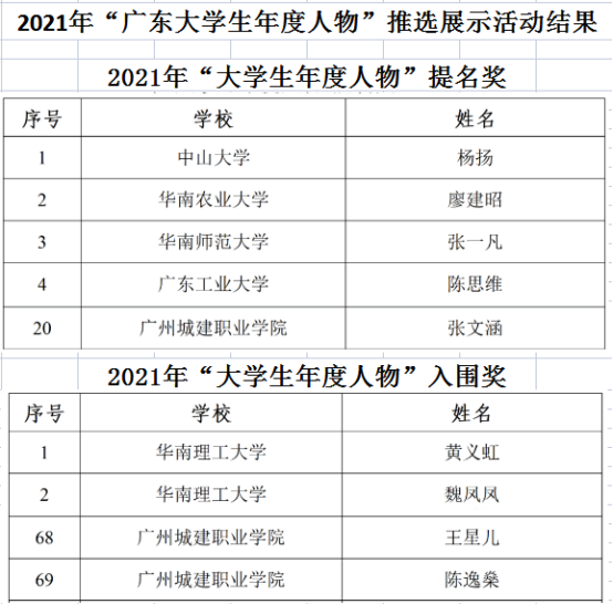 9月12日,由廣東省教育廳發(fā)起的2021年“廣東大學生年度人物”推選展示活動結(jié)果揭曉。此次活動共推選出2021年“廣東大學生年度人物”10名、2021年“廣東大學生年度人物”提名獎20名、2021年“廣東大學生年度人物”入圍獎70名。我校建筑工程學院張文涵同學榮獲“廣東大學生年度人物”提名獎,藝術(shù)與設計學院王星兒同學、外語外貿(mào)學院陳逸燊同學榮獲“廣東大學生年度人物”入圍獎,我校獲獎數(shù)量居同類高職院校第一。