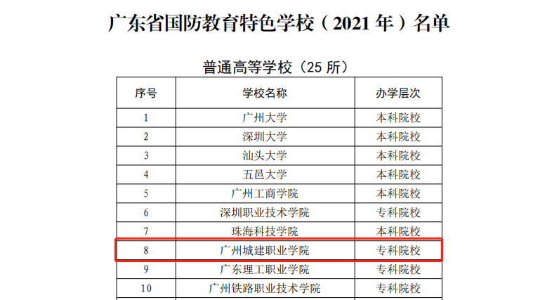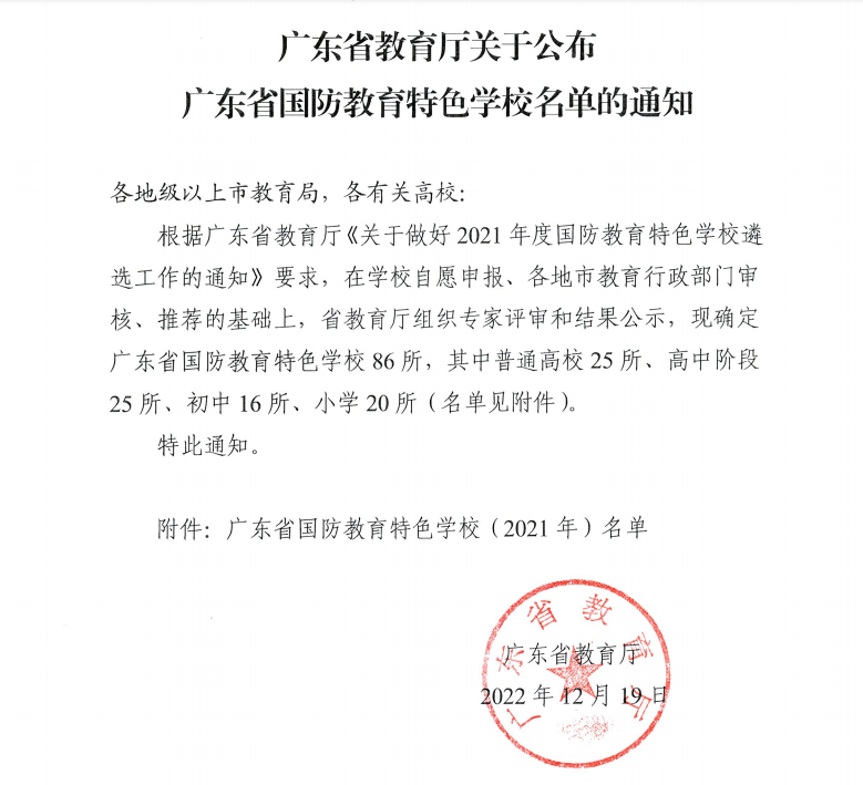 近日,省教育廳公布了“廣東省國防教育特色學校”名單,在全省各學校自主申報,各地市教育行政部門審核、推薦的基礎(chǔ)上,省教育廳組織專家進行評審,最終86所學校被評為“廣東省國防教育特色學?!?,其中高校25所,我校成功入選。