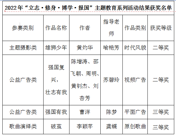 近日,廣東省教育廳公布了《2022年“立志·修身·博學(xué)·報(bào)國”主題教育系列活動(dòng)結(jié)果的通知》,我校師生團(tuán)隊(duì)參賽作品分別在主題攝影類、歌曲演繹類和公益廣告類項(xiàng)目中榮獲二等獎(jiǎng)2項(xiàng),三等獎(jiǎng)2項(xiàng),獲獎(jiǎng)數(shù)量位居同類院校前列。