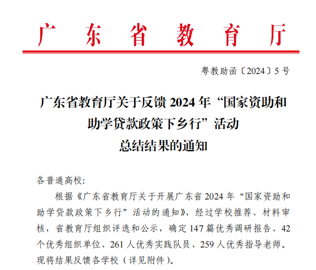 近日,廣東省教育廳公布了2024年“國家資助和助學(xué)貸款政策下鄉(xiāng)行”活動的評選結(jié)果,我校被評為“優(yōu)秀組織單位”并獲得多項省級表彰,其中榮獲優(yōu)秀調(diào)研報告2篇、優(yōu)秀實踐隊員2名、優(yōu)秀指導(dǎo)老師2名,充分展現(xiàn)了我校在國家資助和助學(xué)貸款政策宣傳、教育和實踐方面的顯著成效。