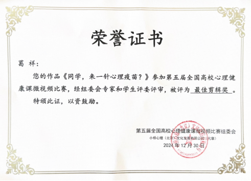 2024年12月11日,第五屆全國高校心理健康課微視頻決賽落下帷幕。本次比賽吸引了來自26個省份、108所高校參加,經(jīng)過激烈角逐,大賽評審出一等獎8項(xiàng)、二等獎16項(xiàng)、三等獎24項(xiàng),以及最佳剪輯獎5項(xiàng)等多個獎項(xiàng),其中,我校心理健康咨詢中心專職教師葛祥的參賽作品《同學(xué),來一針心理疫苗?》榮獲第五屆全國高校心理健康課微視頻比賽三等獎及最佳剪輯獎!