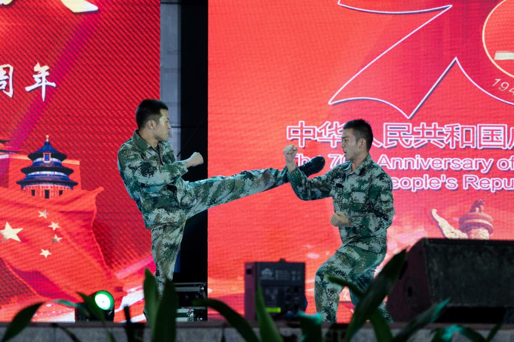 經(jīng)過一周的軍訓(xùn),教官和新生們也結(jié)下了深深的友誼,教官出場也成為晚會(huì)一大亮點(diǎn),教官們獻(xiàn)上歌曲《時(shí)間都去哪了》《男兒當(dāng)自強(qiáng)》,同時(shí)還帶來了軍體拳表演,教官們英姿颯爽,贏得全場熱烈的掌聲和歡呼聲。