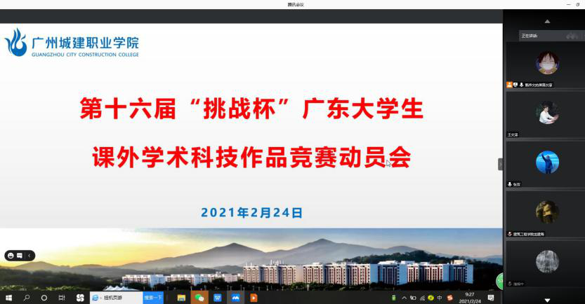 2月24日上午,我校在騰訊會議平臺線上召開第十六屆“挑戰(zhàn)杯”廣東大學(xué)生課外學(xué)術(shù)科技作品競賽動員會,黨委副書記、副校長張德宜,各二級學(xué)院科研、學(xué)工副院長,校、院團(tuán)學(xué)指導(dǎo)老師,參賽師生代表共同參加此次會議。會議由校團(tuán)委書記甄偉文主持。