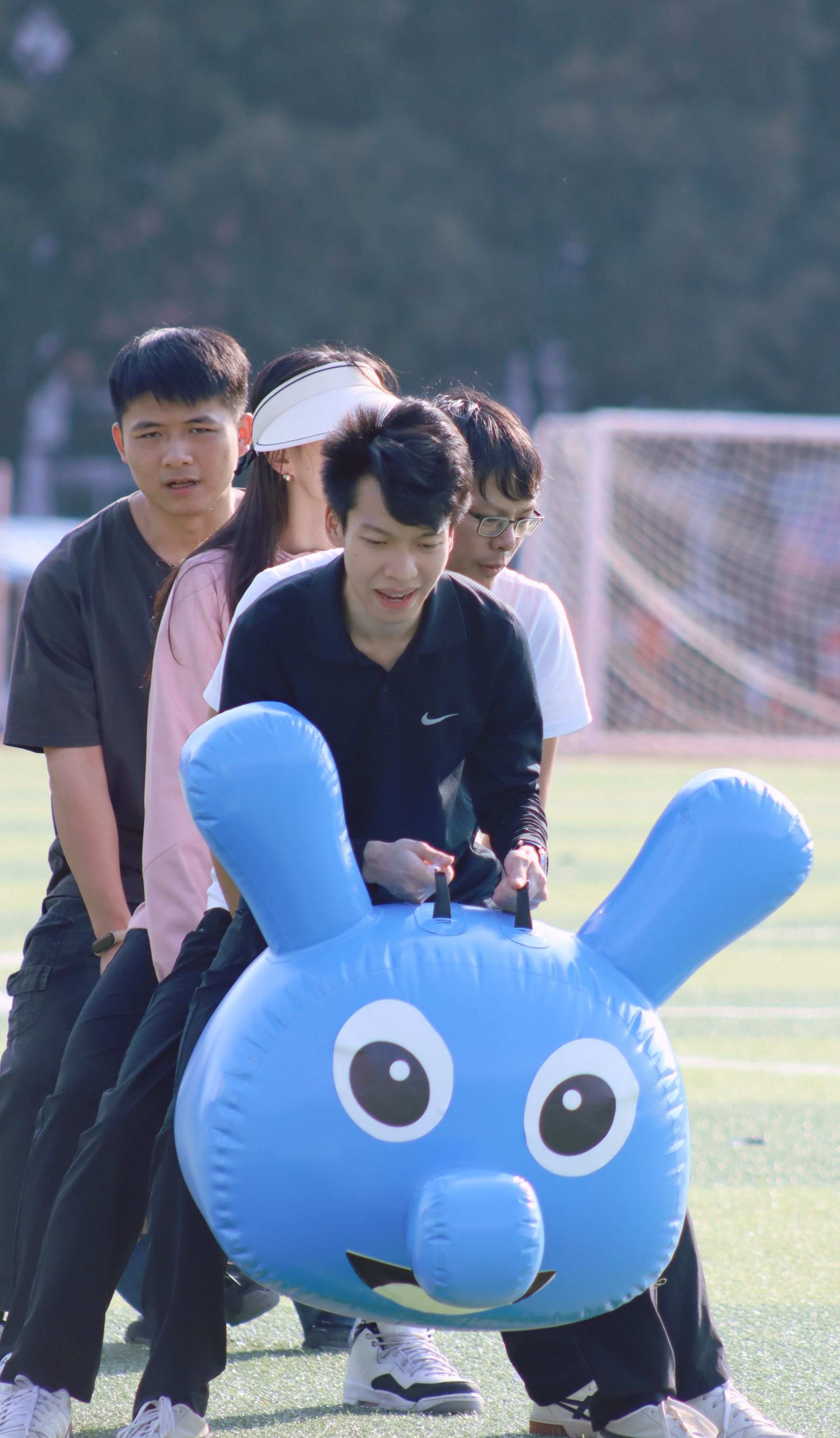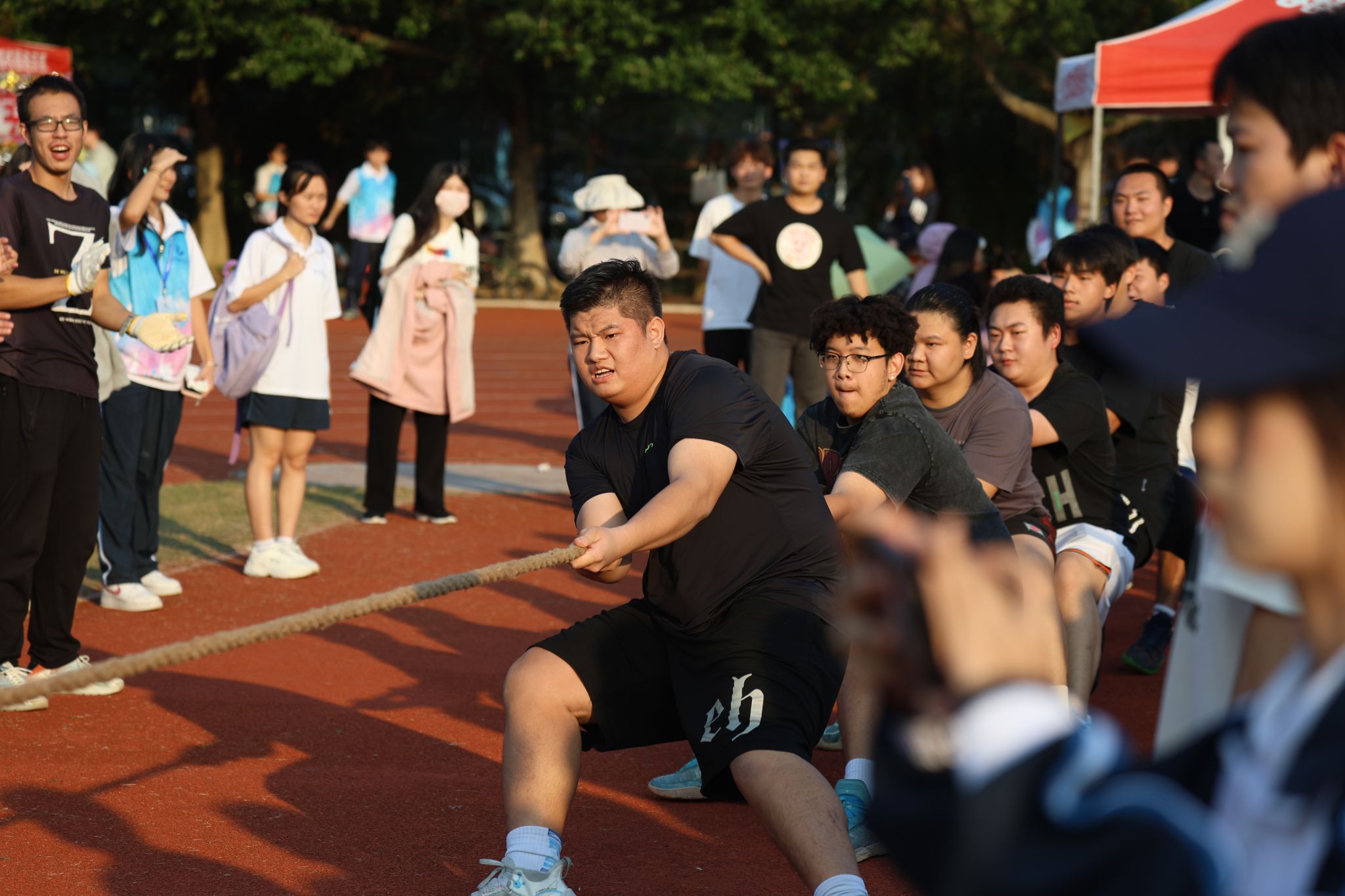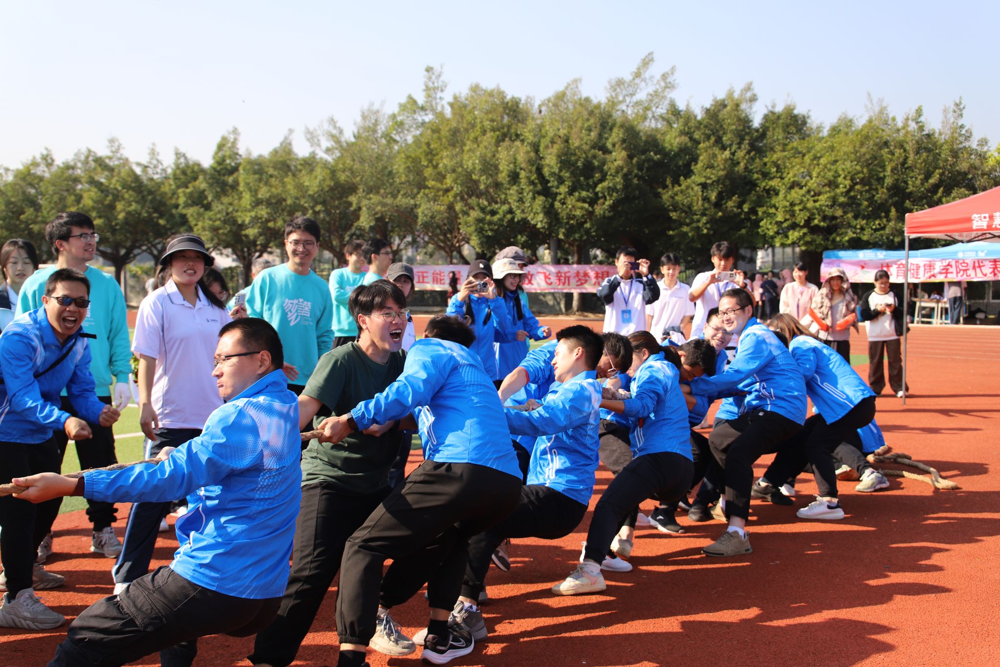 教工運動會上,全校共有14支隊伍、800多名教職工參加。包括“男女混合拔河、神投手團體比賽、傳呼啦圈、運轉(zhuǎn)乾坤、8*50m混合接力、毛毛蟲接力”等團隊項目及“60m短跑、踢毽子、套圈、呼啦圈、蒙眼敲鑼、100米競走”等個人項目,集趣味性和運動性于一體,現(xiàn)場氣氛熱烈。運動場上,運動員們個個鉚足了勁,漲紅了臉,全力以赴;拉拉隊為上陣隊員加油鼓勁,笑聲、歡呼聲、吶喊聲回蕩在田徑場上空。