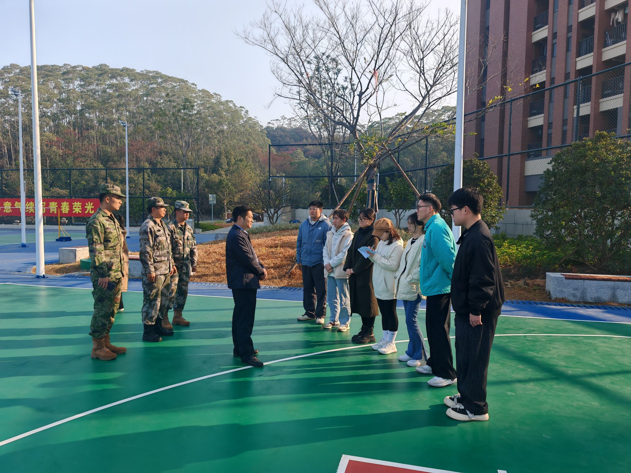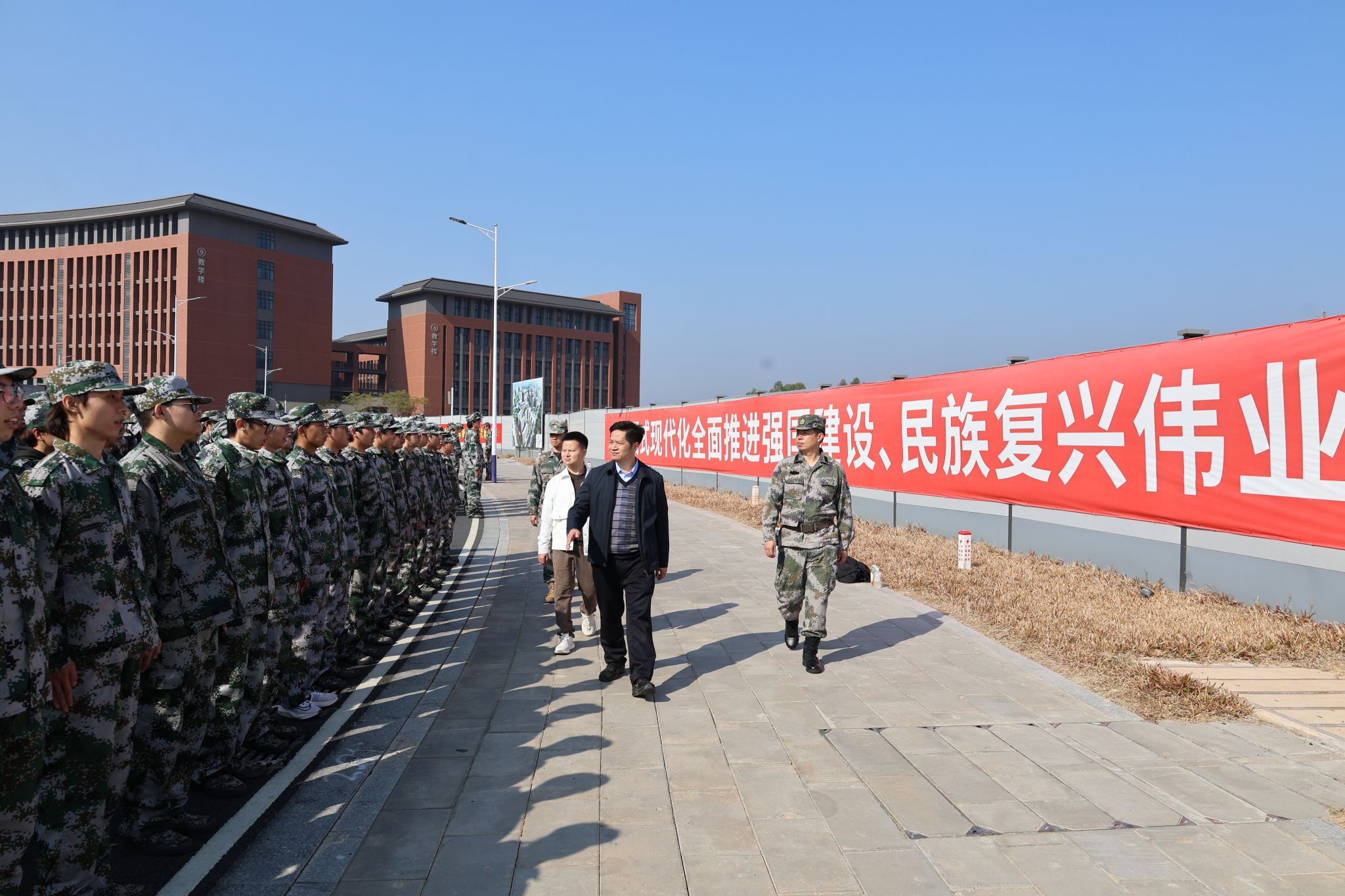1月8日上午,校長助理孔練光來到清遠校區(qū)新生軍訓場地,深入一線檢查指導工作并慰問新生輔導員、承訓教官及全體2024級參訓學生,學生處、團委、武裝部相關負責人陪同參加。