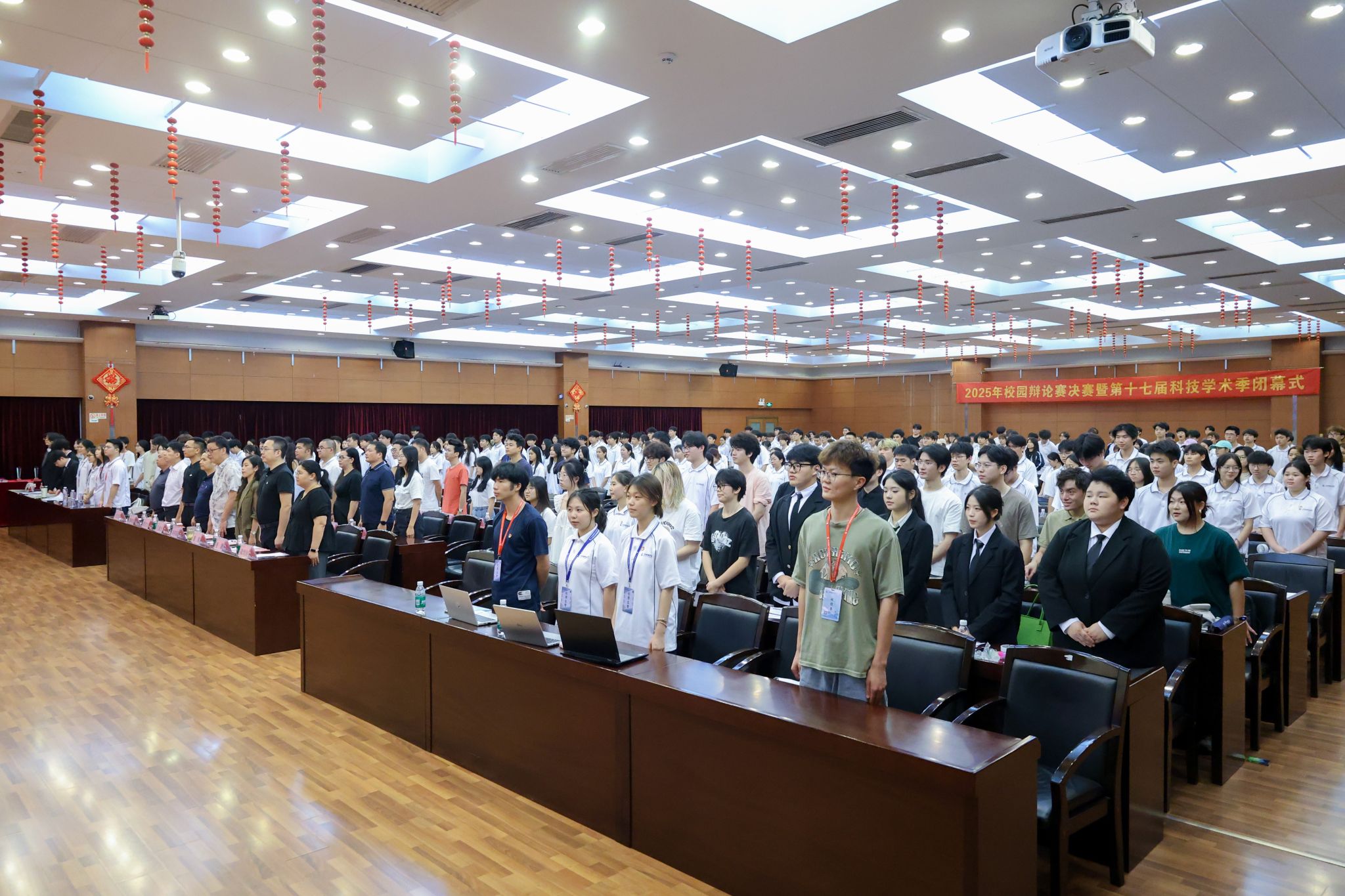6月10日晚,我校2025年校園辯論賽總決賽暨第十七屆科技學(xué)術(shù)季閉幕式在廣州校區(qū)人文藝術(shù)樓四樓報(bào)告廳舉行。學(xué)校黨委委員、校長(zhǎng)助理孔練光,團(tuán)委書(shū)記兼黨委學(xué)生工作部副部長(zhǎng)甄偉文,學(xué)生處副處長(zhǎng)、黨委學(xué)生工作部副部長(zhǎng)譚宇欣以及各二級(jí)學(xué)院黨組織副書(shū)記、副院長(zhǎng)等學(xué)生工作負(fù)責(zé)人出席此次活動(dòng)。人文學(xué)院劉向陽(yáng)、黎婧,馬克思主義學(xué)院張康、梁均玲等四位老師擔(dān)任辯論賽評(píng)委。