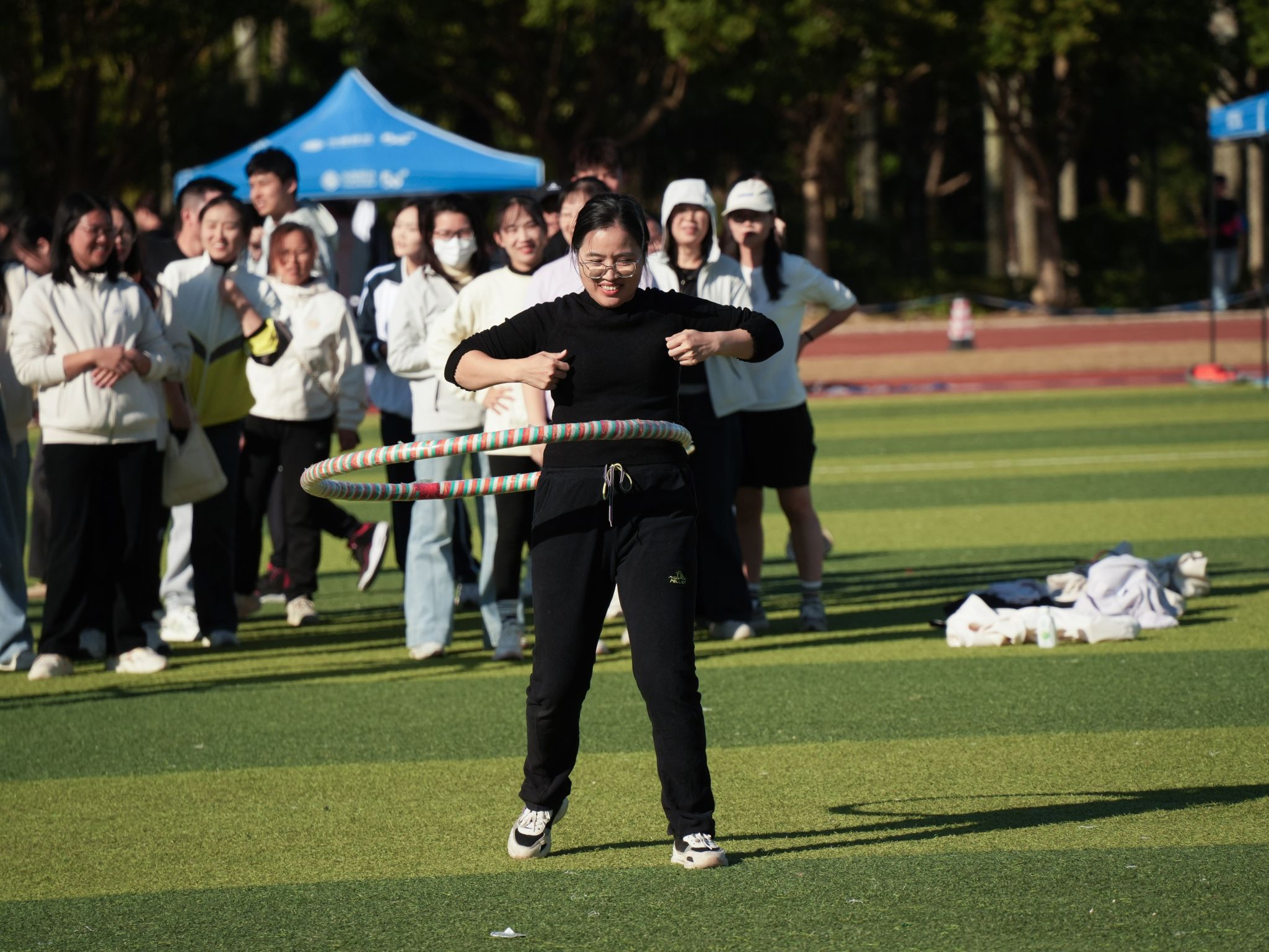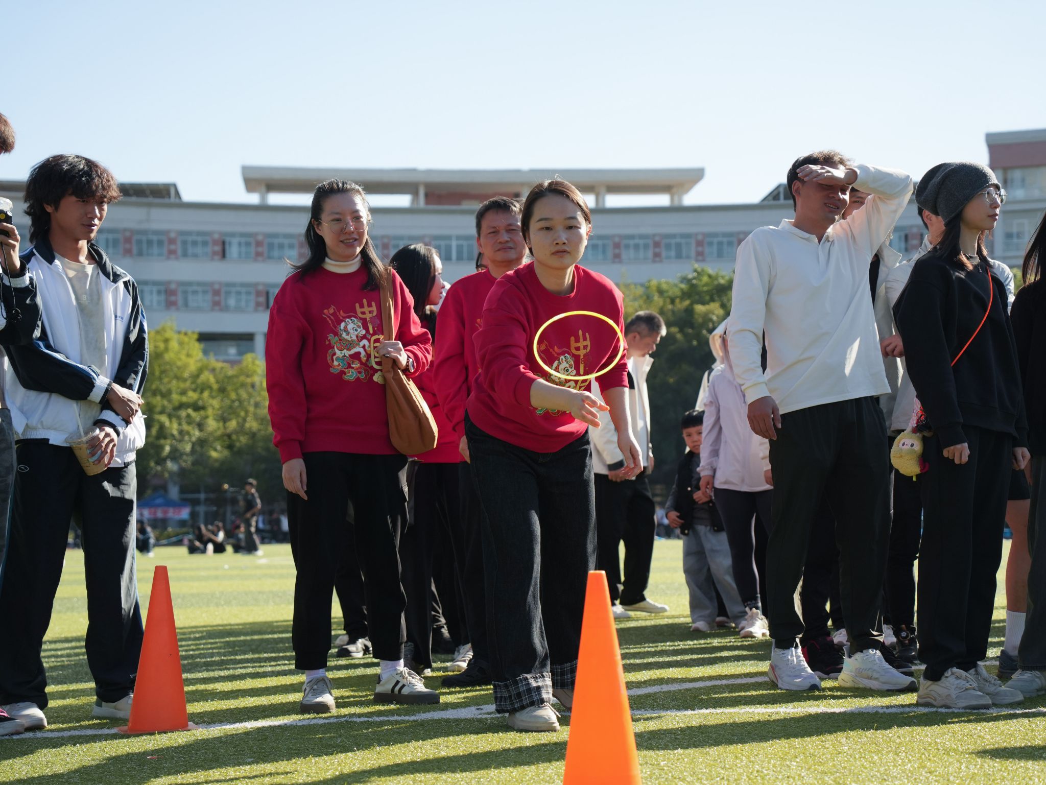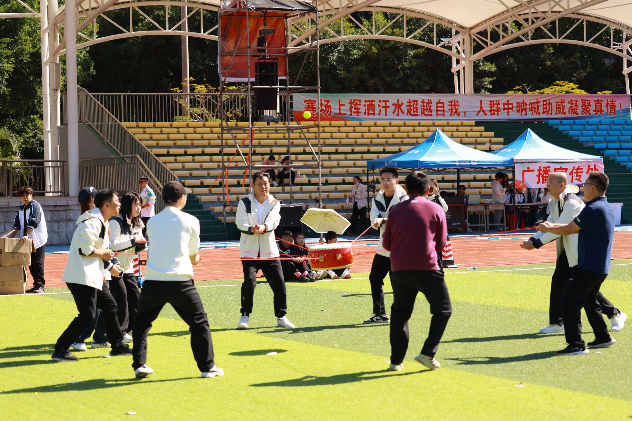 教職工組的比拼同樣精彩紛呈。賽事設(shè)置充滿趣味與溫情,團(tuán)體項(xiàng)目中,拔河的全力以赴、乒乓球接力賽的穩(wěn)健迅捷、傳呼啦圈的靈活默契、混合接力跑的團(tuán)結(jié)協(xié)作,展現(xiàn)出濃厚的團(tuán)隊(duì)精神;個(gè)人項(xiàng)目中,捶丸的專注、呼啦圈的靈動(dòng)、蒙眼敲鑼的趣味、競(jìng)走的堅(jiān)持、套圈的精準(zhǔn),每個(gè)項(xiàng)目都引來(lái)陣陣喝彩。老師們暫離講臺(tái),在賽場(chǎng)上展現(xiàn)出活力四射、昂揚(yáng)向上的別樣風(fēng)采,贏得了全場(chǎng)觀眾的掌聲與歡呼。