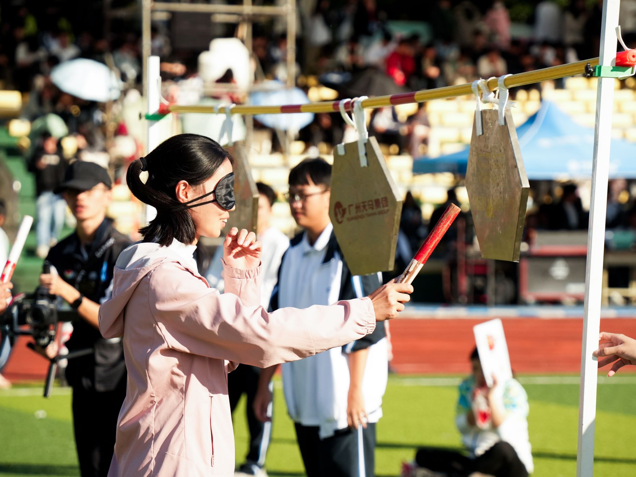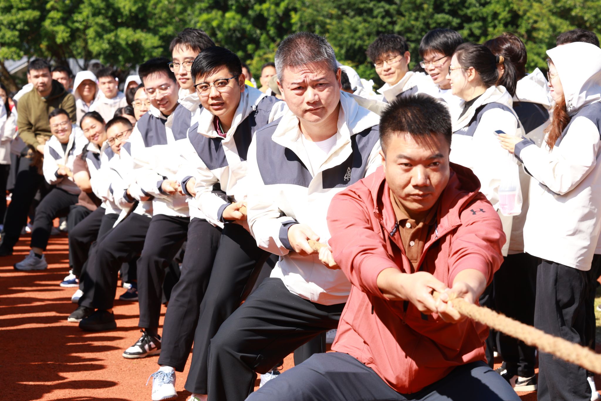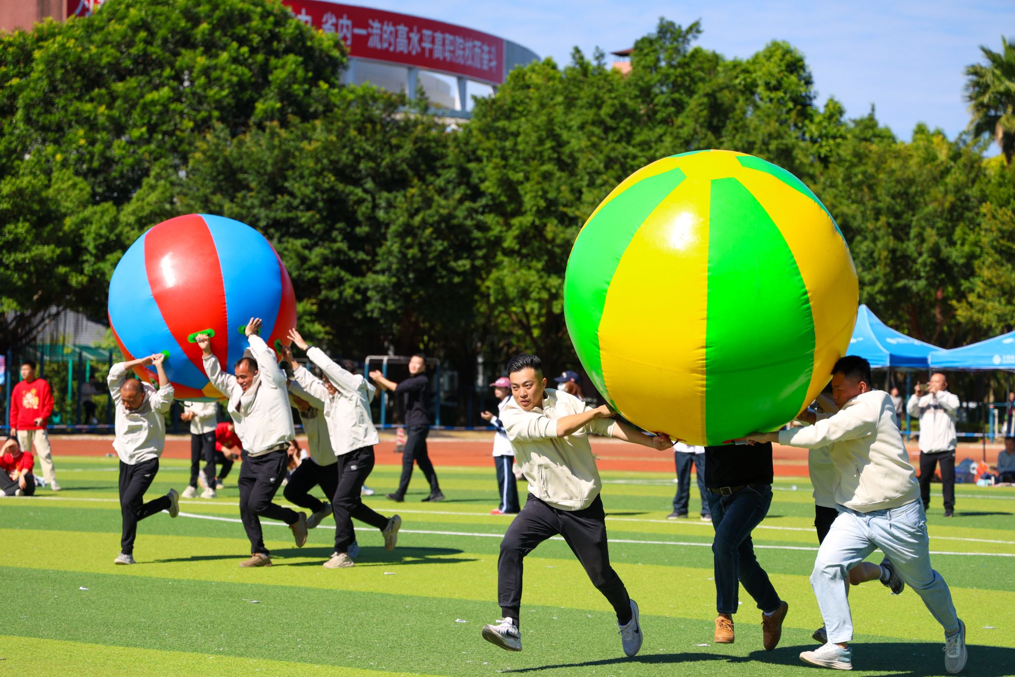 教職工組的比拼同樣精彩紛呈。賽事設(shè)置充滿趣味與溫情,團(tuán)體項(xiàng)目中,拔河的全力以赴、乒乓球接力賽的穩(wěn)健迅捷、傳呼啦圈的靈活默契、混合接力跑的團(tuán)結(jié)協(xié)作,展現(xiàn)出濃厚的團(tuán)隊(duì)精神;個(gè)人項(xiàng)目中,捶丸的專注、呼啦圈的靈動(dòng)、蒙眼敲鑼的趣味、競(jìng)走的堅(jiān)持、套圈的精準(zhǔn),每個(gè)項(xiàng)目都引來(lái)陣陣喝彩。老師們暫離講臺(tái),在賽場(chǎng)上展現(xiàn)出活力四射、昂揚(yáng)向上的別樣風(fēng)采,贏得了全場(chǎng)觀眾的掌聲與歡呼。