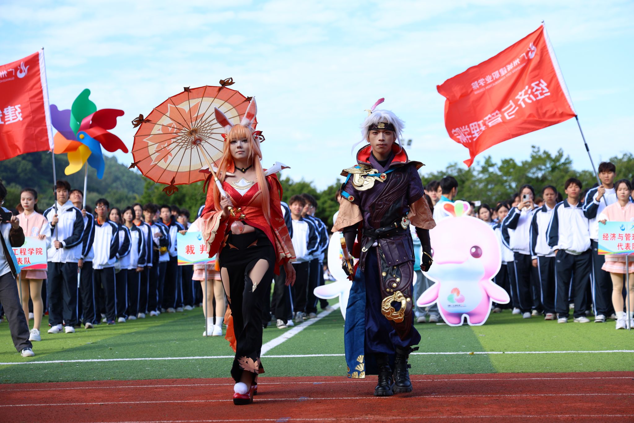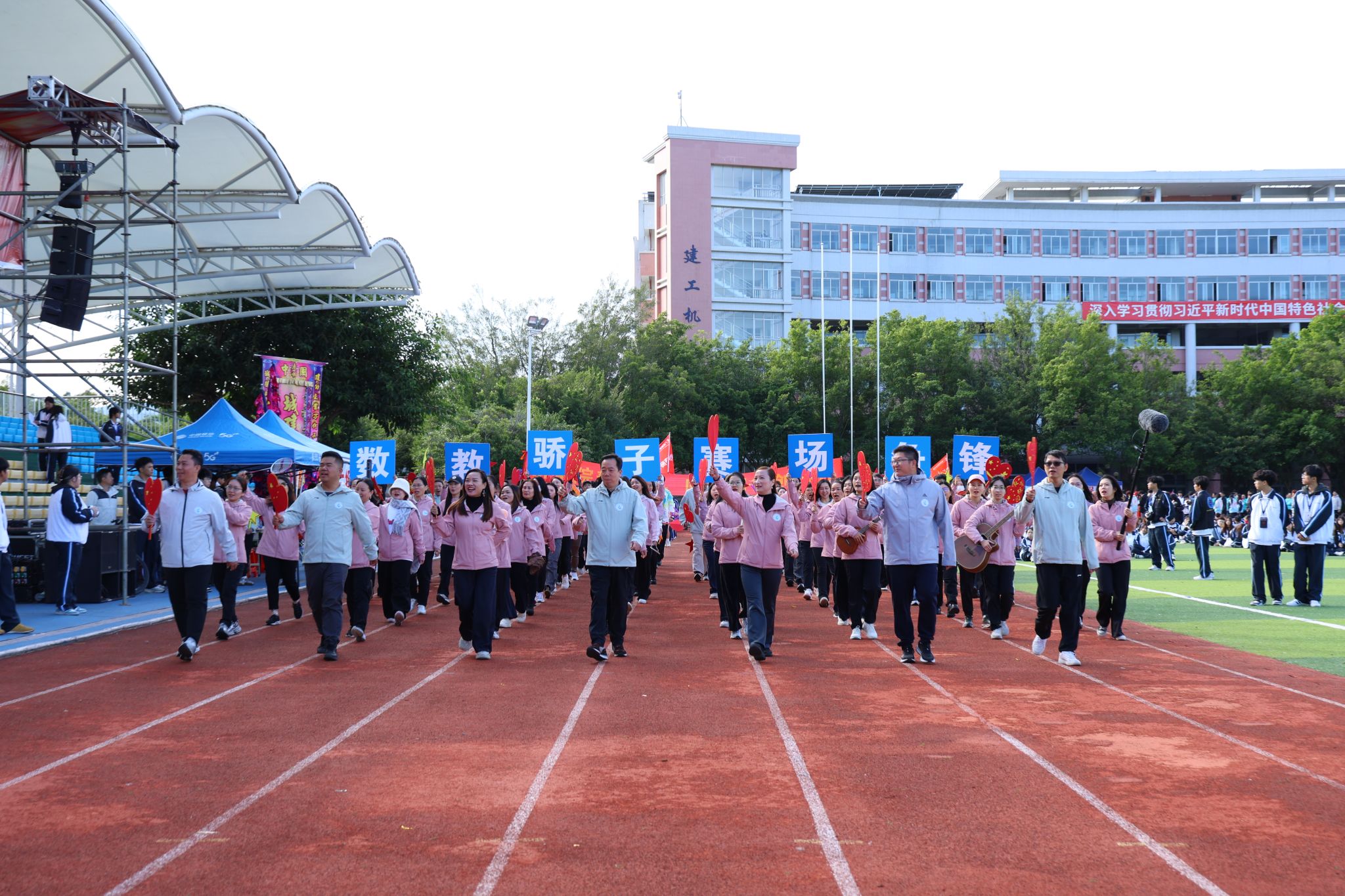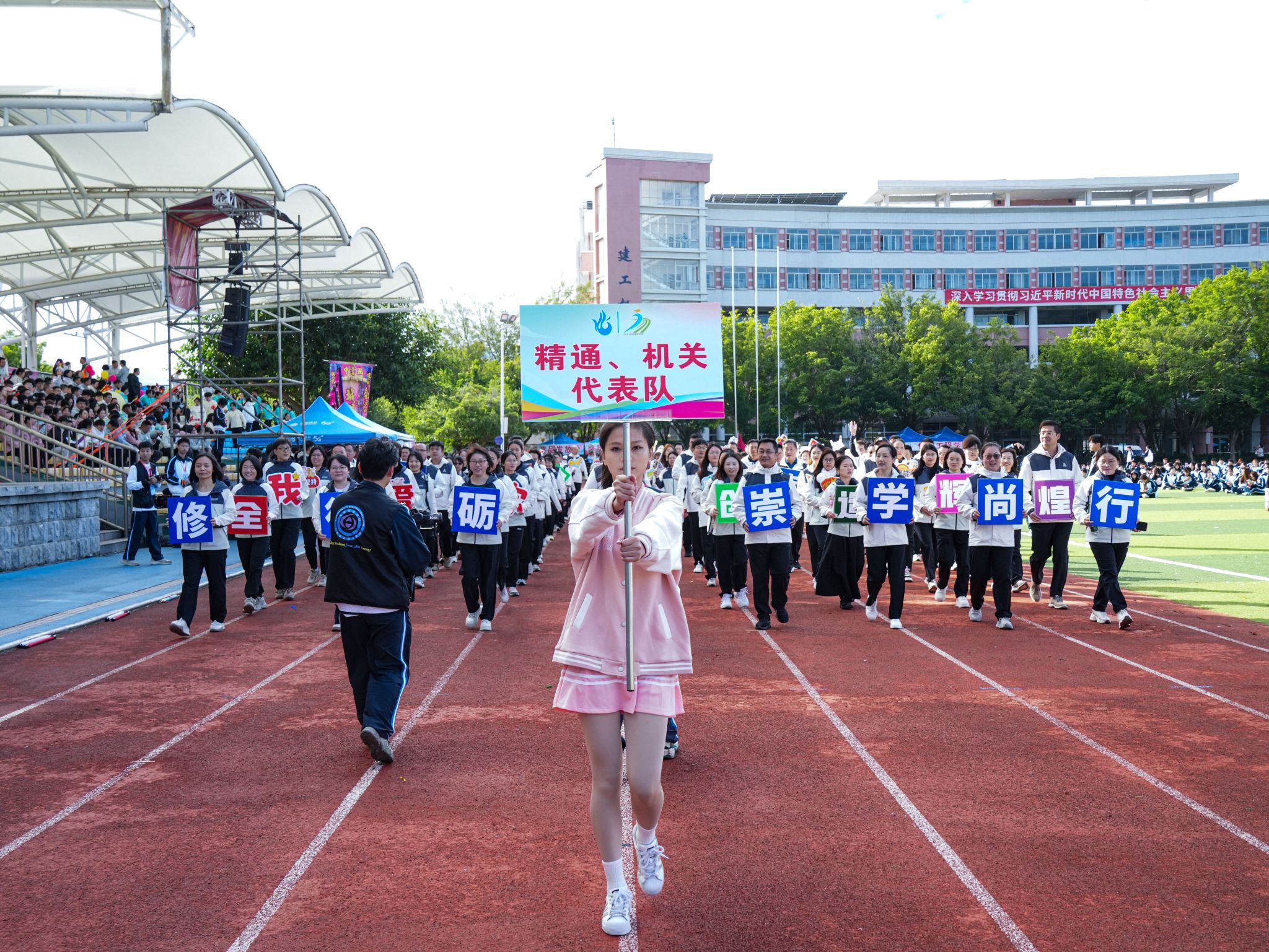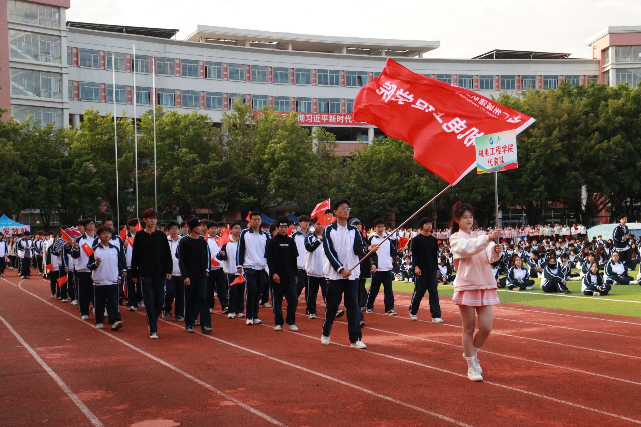 伴隨著雄壯激昂的《運(yùn)動(dòng)員進(jìn)行曲》,國(guó)旗、校旗、運(yùn)動(dòng)會(huì)會(huì)旗、裁判員、十五運(yùn)會(huì)和殘?zhí)貖W會(huì)志愿者、各二級(jí)學(xué)院、機(jī)關(guān)、保衛(wèi)、后勤等方陣逐一亮相,有序入場(chǎng)。他們精神抖擻,口號(hào)響亮,創(chuàng)意迭出,以昂揚(yáng)風(fēng)貌展現(xiàn)了城建人的蓬勃朝氣與強(qiáng)大凝聚力。