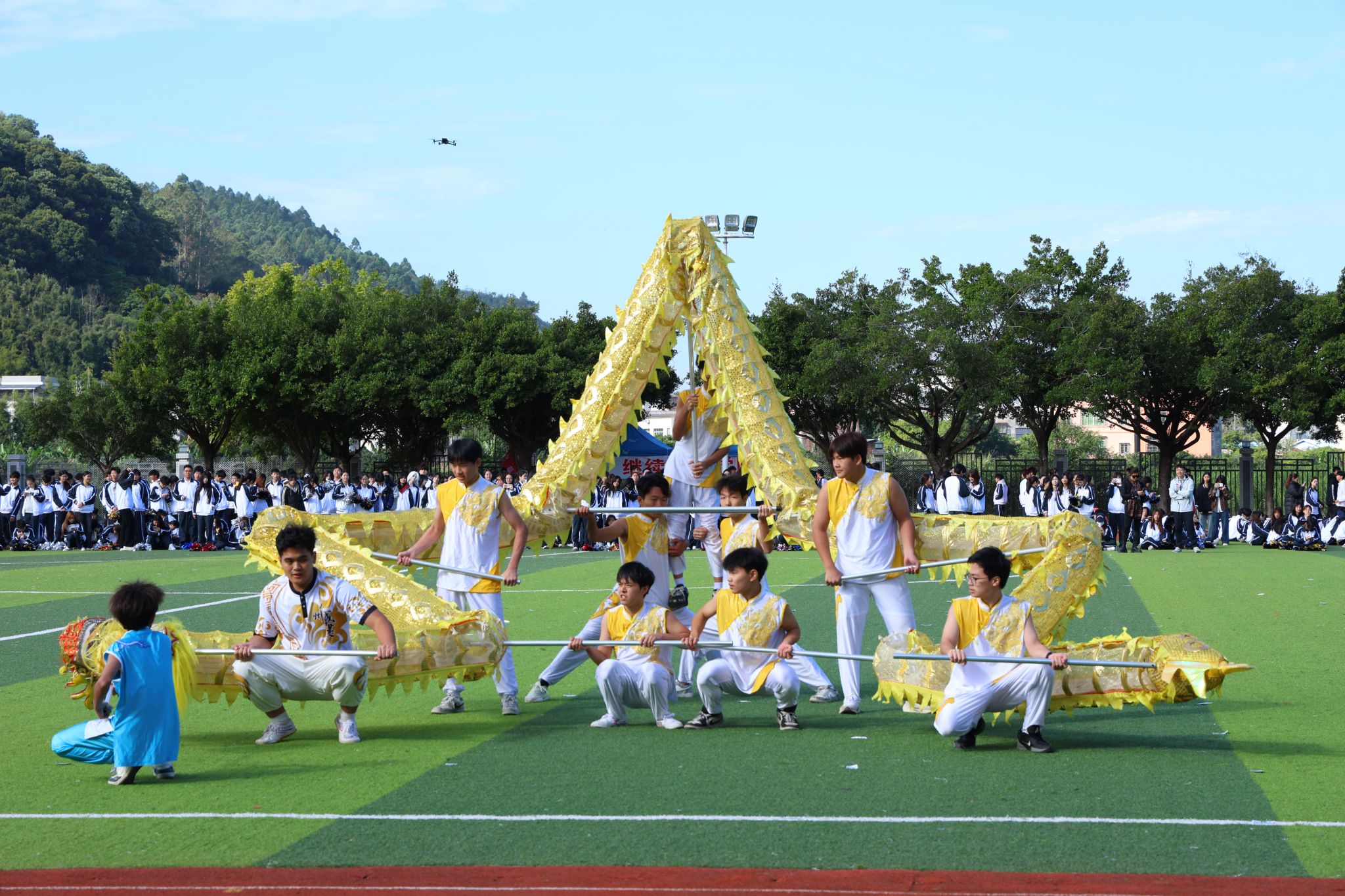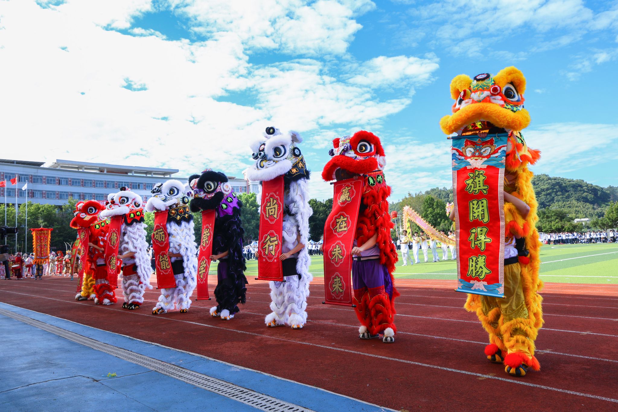 開(kāi)幕式上,張亞斌、黃學(xué)茭、李國(guó)年共同執(zhí)筆,為新龍和新獅子點(diǎn)睛。接著,一系列精彩表演輪番上演,剛勁威猛的龍獅表演,舞動(dòng)出傳統(tǒng)文化的雄渾氣韻;氣勢(shì)磅礴的英歌舞,躍動(dòng)著青春的節(jié)奏與力量;柔和連綿的千人八段錦,在一招一式中蘊(yùn)藏著動(dòng)靜相生的養(yǎng)生智慧;最后,活力四射的千人啦啦操表演瞬間點(diǎn)燃全場(chǎng)激情,為運(yùn)動(dòng)健兒加油助威。