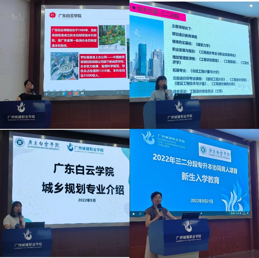 會上,唐玉群首先對廣東白云學院領導的到來表示歡迎,鼓勵與會新生明確專業(yè)學習目標,努力學好專業(yè)知識、提升專業(yè)技能,不斷提升綜合素質(zhì),預祝同學們?nèi)旰笕缙诔蔀榘自茖W院學生。馬迎春簡要介紹了廣東白云學院的辦學背景、辦學規(guī)模、辦學模式,曹玉華、工程造價系主任趙蓓蕾、建筑系副主任邢璐分別對三個專業(yè)的人才培養(yǎng)方案、考核方案等進行了詳細講解。參會新生在聽完介紹后,對考核標準、考試范圍以及培養(yǎng)課程安排等方面提出自己的疑問并得到兩校老師詳細的解答。