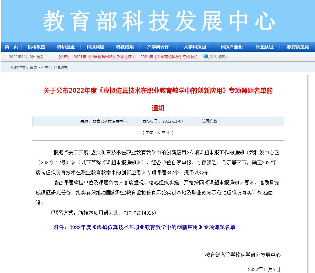 11月7日,教育部高等學(xué)校科學(xué)研究發(fā)展中心發(fā)布了《關(guān)于公布2022年度<虛擬仿真技術(shù)在職業(yè)教育教學(xué)中的創(chuàng)新應(yīng)用>專項(xiàng)課題名單的通知》,學(xué)校申報(bào)的《基于虛擬仿真技術(shù)的機(jī)電一體化技術(shù)專業(yè)群人才培養(yǎng)方案優(yōu)化研究》獲批立項(xiàng)。