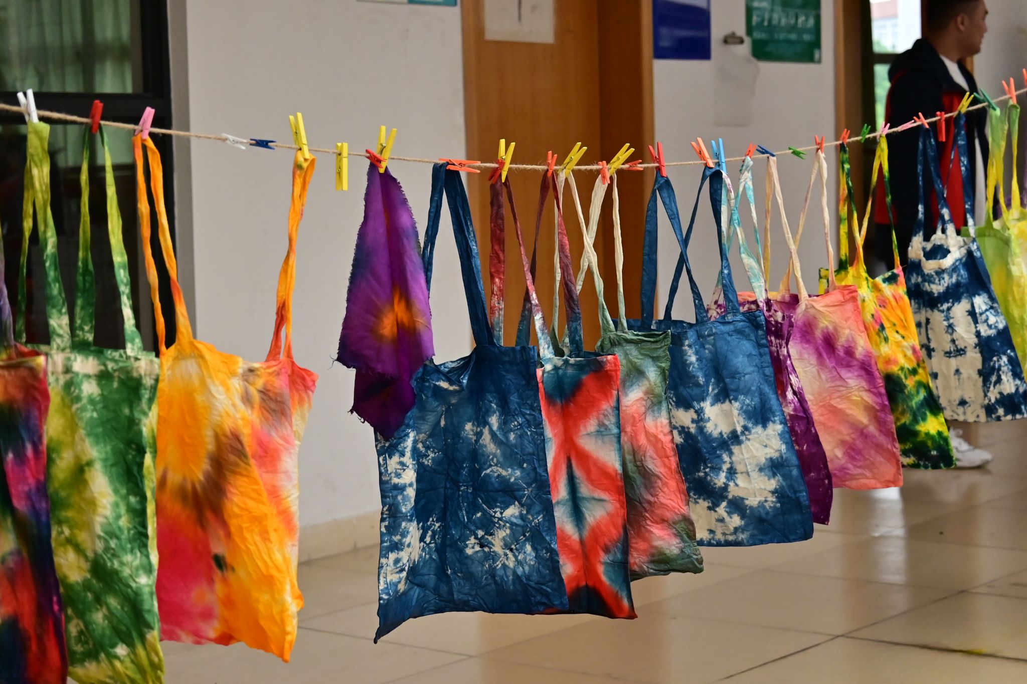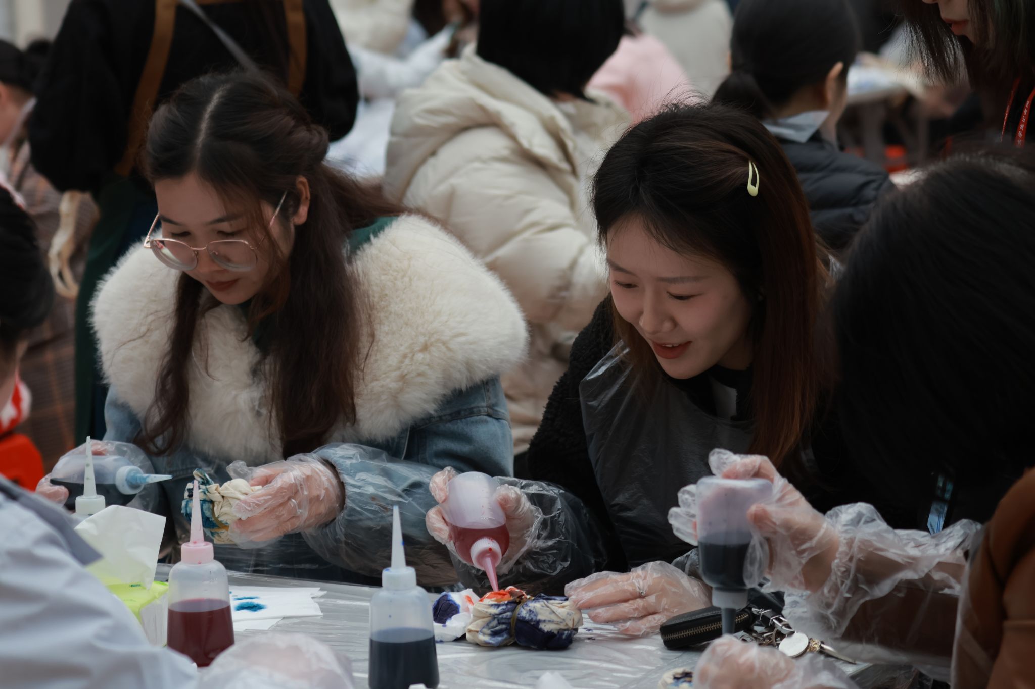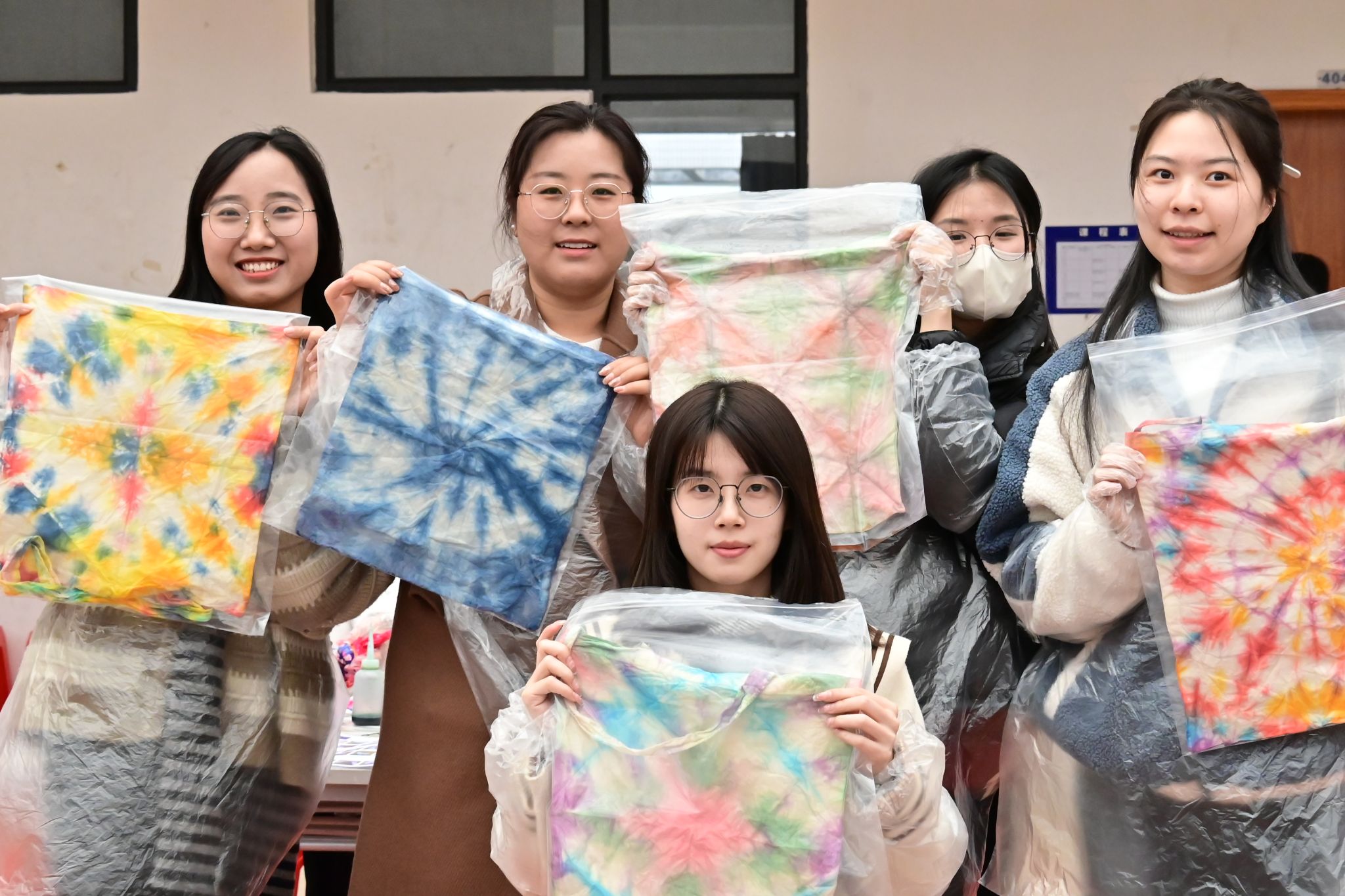 活動過程中,專業(yè)老師詳細(xì)講解了扎染的工藝原理、扎花重點(diǎn)、浸染手法以及制作必備的各種材料,現(xiàn)場示范扎結(jié)與染色具體制作流程,女教職工們在老師的帶領(lǐng)下通過洗布、扎花、浸染、晾干等步驟,紛紛DIY出獨(dú)一無二的彩色帆布袋。