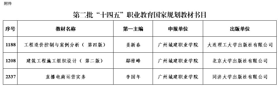 近日,教育部發(fā)布《關(guān)于公布第二批“十四五”職業(yè)教育國(guó)家規(guī)劃教材書目的公告》,我校教師主編的《工程造價(jià)控制與案例分析(第四版)》、《建筑工程施工組織設(shè)計(jì)(第二版)》和《直播電商運(yùn)營(yíng)實(shí)務(wù)》3種教材成功入選。