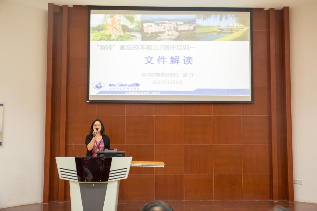 李副校長指出,學校開展“雙師”素質校本能力測評工作目的是引導廣大教師踐行“理實一體”教學理念,提高“雙師”教學能力和生產性實訓水平,建設符合我校校情的“雙師型”教師隊伍。同時強調,“雙師”素質校本能力測評工作為我校師資隊伍建設一項創(chuàng)新型工作,學校高度重視,經過一段時間的籌備努力后,即將啟動對5個省級品牌(重點)專業(yè)“雙師”素質校本能力2的測評,本次培訓主要是學習理解學校相關文件精神,了解測評工作相關要求。隨后,實訓管理與設備處副處長潘丹從測評目的、內容、地點、時間和由誰執(zhí)行等五方面對《“雙師”校本能力資格認定與測評細則(試行)》和《2017年上半年“雙師”素質校本能力2測評工作方案》文件進行解讀。