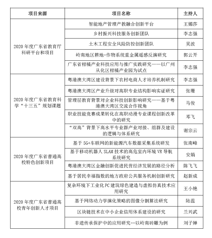 近日,2020年廣東省教育廳科研平臺(tái)及項(xiàng)目和廣東省教育科學(xué)“十三五”規(guī)劃課題立項(xiàng)名單正式發(fā)布,我校18個(gè)科研項(xiàng)目獲立項(xiàng),其中創(chuàng)新平臺(tái)1項(xiàng)、團(tuán)隊(duì)項(xiàng)目2項(xiàng)、科研項(xiàng)目2項(xiàng)、特色創(chuàng)新和青年人才項(xiàng)目各4項(xiàng),廣東省教育科學(xué)“十三五”規(guī)劃課題5項(xiàng),立項(xiàng)總數(shù)及立項(xiàng)率較去年又創(chuàng)新高,在全省民辦高職院校立項(xiàng)數(shù)量中名列前茅。