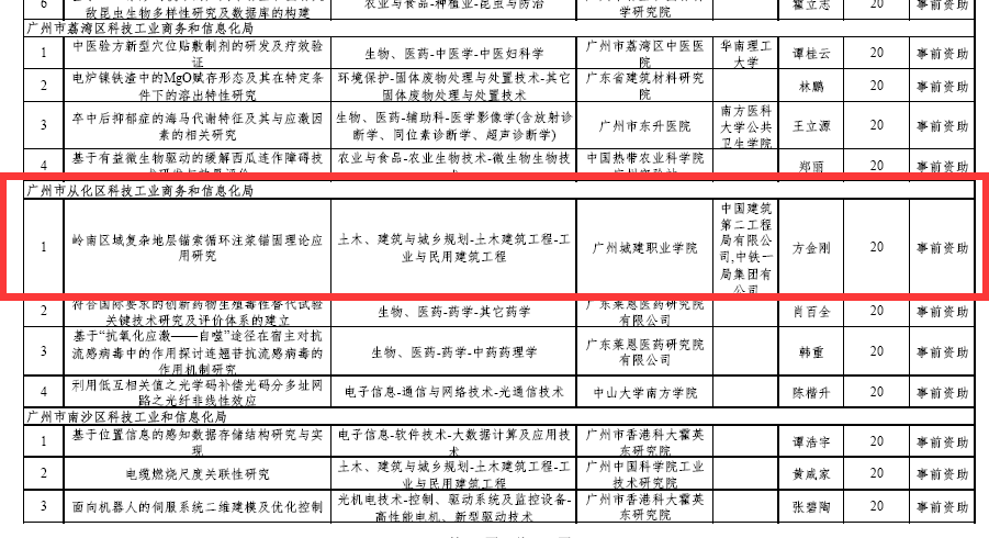 10月31日,我校從廣州市科學技術(shù)局獲悉,2020年市基礎(chǔ)研究計劃基礎(chǔ)與應用基礎(chǔ)研究項目擬立項項目已經(jīng)結(jié)束公示,我校建筑工程學院方金剛副教授主持的《嶺南區(qū)域復雜地層錨索循環(huán)注漿錨固理論應用研究》將獲立項,并將于明年3月簽訂合同。此項目是學校首次獲得廣州市科技計劃項目立項,也是近年來縱向科研項目下?lián)芙?jīng)費額度的最高數(shù),達20萬元,更是此次民辦高職院校擬立項2項中的1項。