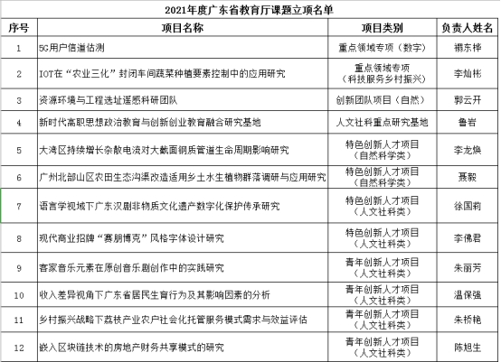 近日,在《2021年廣東省普通高校重點(diǎn)科研平臺和項(xiàng)目擬立項(xiàng)名單》和《廣東省教育廳關(guān)于公布2021年度普通高校認(rèn)定類科研項(xiàng)目立項(xiàng)名單的通知》中,我校12位教師的項(xiàng)目獲準(zhǔn)立項(xiàng),其中重點(diǎn)領(lǐng)域2項(xiàng),創(chuàng)新團(tuán)隊(duì)(自然科學(xué))1項(xiàng),重點(diǎn)平臺1項(xiàng),特色創(chuàng)新項(xiàng)目4項(xiàng),青年創(chuàng)新項(xiàng)目4項(xiàng),立項(xiàng)數(shù)位于全省民辦高校前茅。