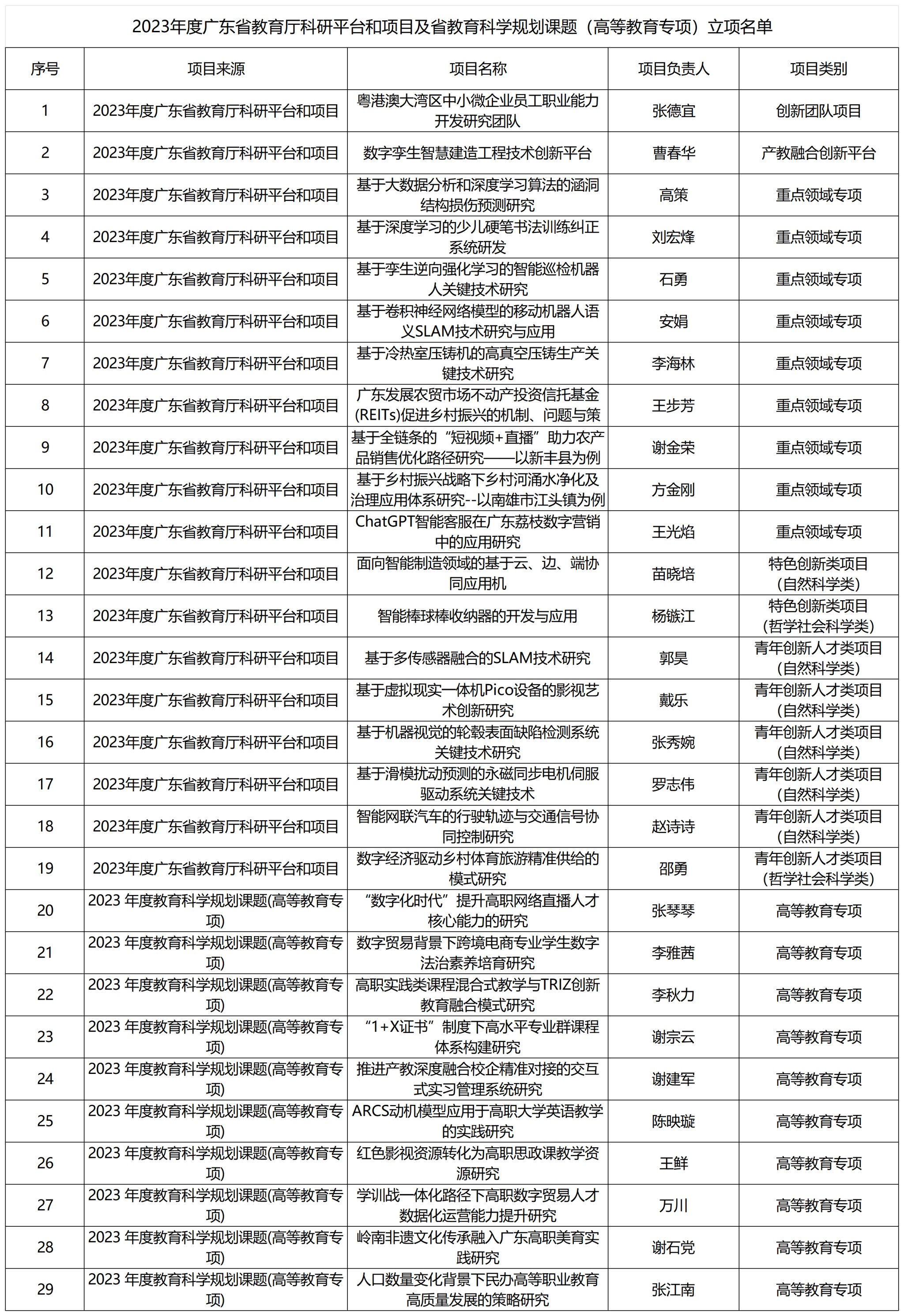 近日,根據(jù)《廣東省教育廳關于公布2023年度普通高校認定類科研項目立項名單的通知》(粵教科函〔2023〕8號)、《廣東省教育廳關于公布2023年度普通高校重點科研平臺和項目立項名單的通知》(粵教科函〔2023〕9號)和《廣東省教育科學規(guī)劃領導小組辦公室關于公布2023年度教育科學規(guī)劃課題(高等教育專項)立項名單的通知》,我校共有29個項目獲準立項:重點領域?qū)m?項,立項數(shù)居全省高職院校第七(民辦高職院校第一);創(chuàng)新團隊項目1項(民辦高職院校唯一);產(chǎn)教融合創(chuàng)新平臺1項,特色創(chuàng)新項目2項,青年創(chuàng)新人才項目6項;教育科學規(guī)劃課題(高等教育專項)10項,立項數(shù)居全省高職院校第四(民辦高職院校第一)。