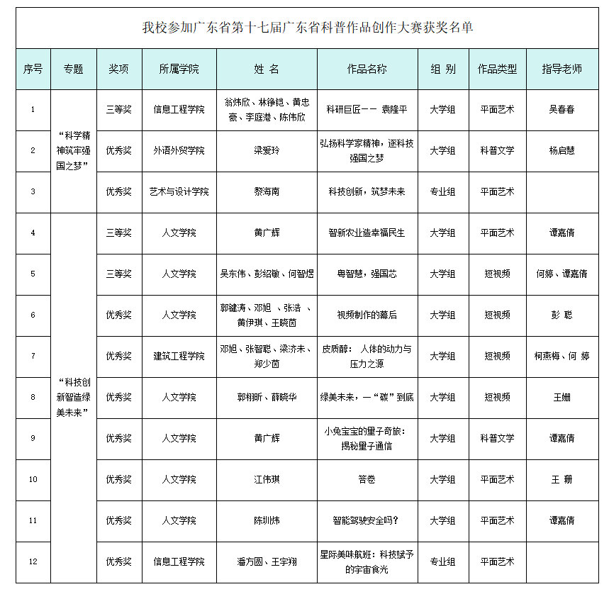 近日,由廣東省科學(xué)技術(shù)協(xié)會、中共廣東省委宣傳部、廣東省教育廳、廣東省科學(xué)技術(shù)廳、廣東省衛(wèi)生健康委員會、廣東省林業(yè)局、中國科學(xué)院廣州分院、廣東省科學(xué)院聯(lián)合主辦的第十七屆廣東省科普作品創(chuàng)作大賽公布獲獎名單,我校共有12個項目獲獎。